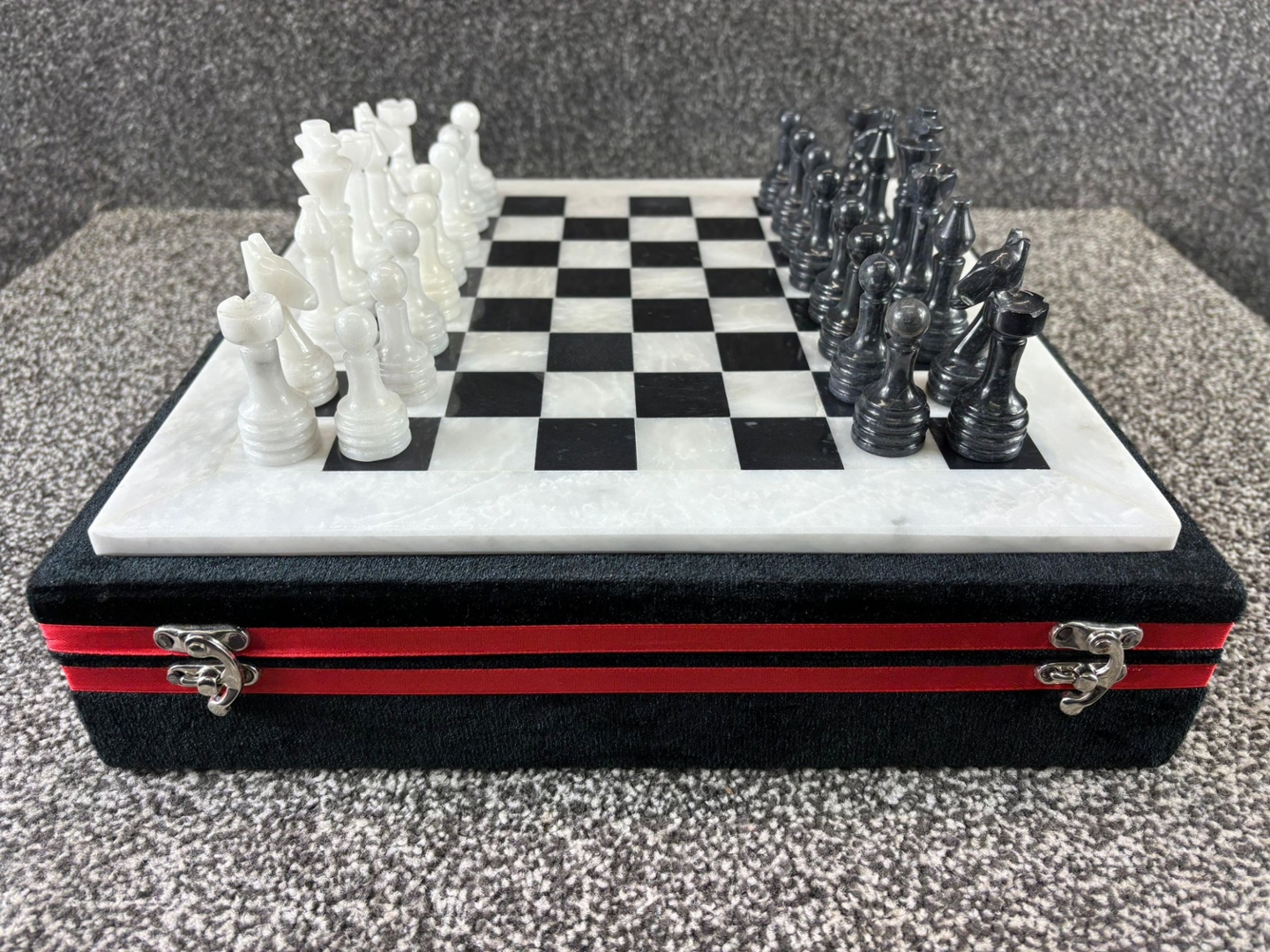 A black and white hand carved marble chess set with a velvet storage case. Approximately 12" length, 12" width.