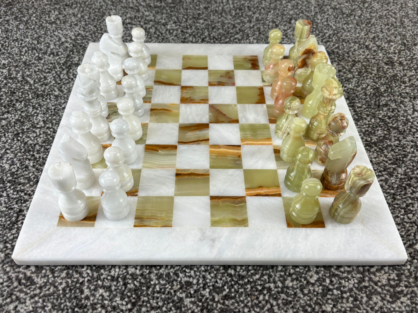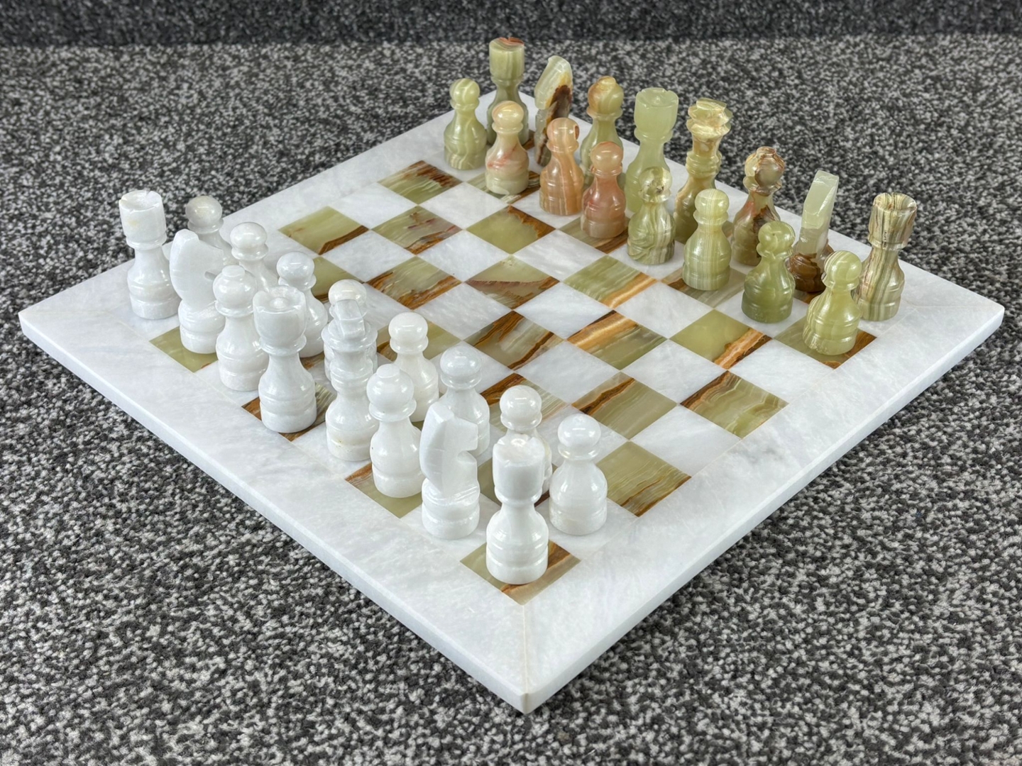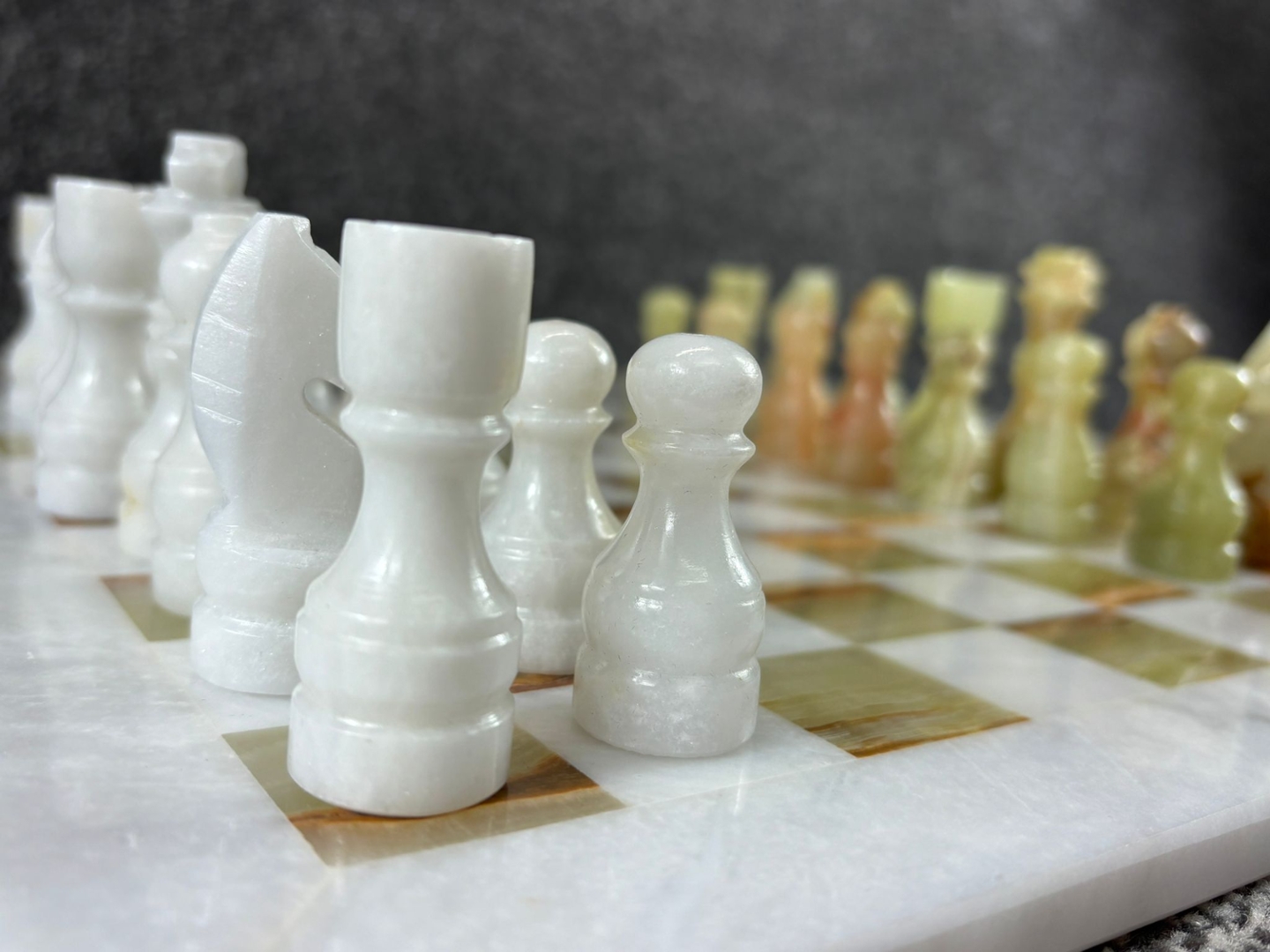 A green and white hand carved marble chess set that combines natural artistry with the elegance of traditional gameplay. Each piece is sculpted from richly veined marble, showcasing soft green, earthy brown, and creamy white tones that make every figure unique. The smooth finish and weight of the stone give the set a luxurious feel, while it's compact 12-inch by 12-inch size makes it perfect for both display and play.