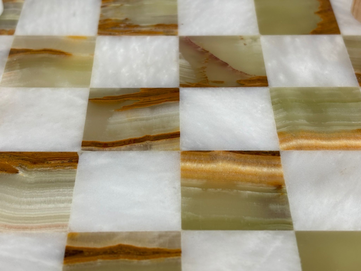 The marble chessboard itself is a standout, featuring alternating squares of green and white with warm natural striations running through the stone. This striking colour combination enhances the beauty of the carved pieces, creating a set that is as decorative as it is functional.