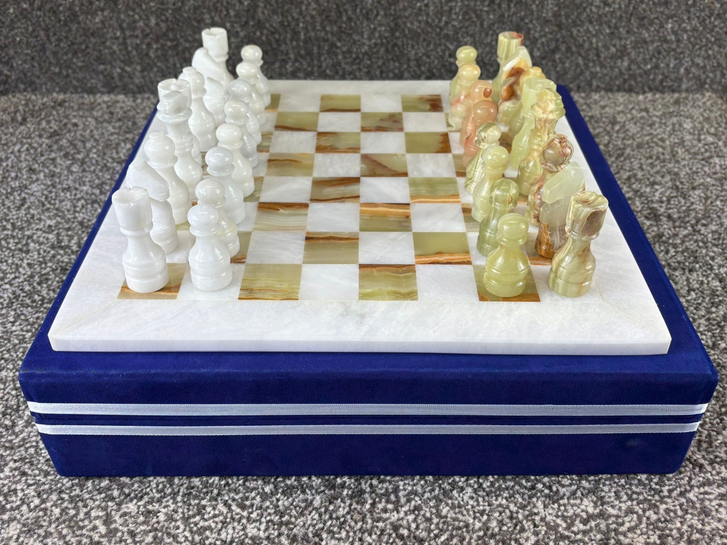 A green and white hand carved marble chess set with a velvet storage case. Approximately 12" length, 12" width.