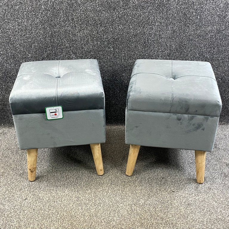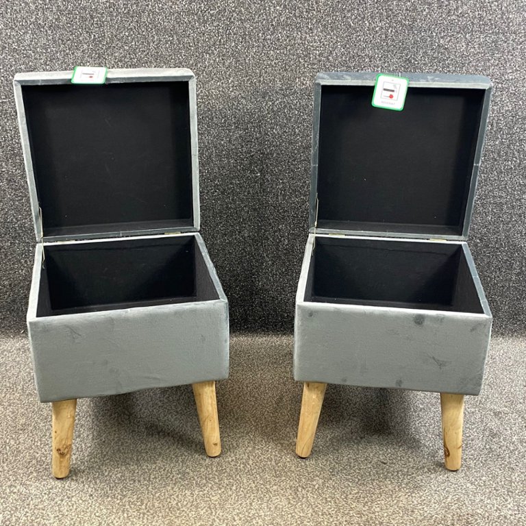 A pair of grey french velvet square storage stools on wooden legs. Approx 11" height, 17" width.