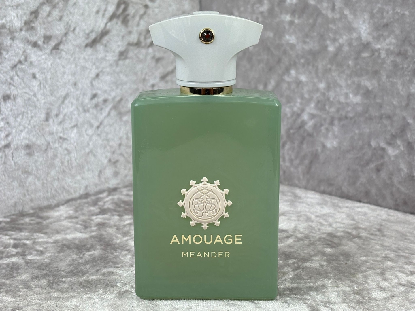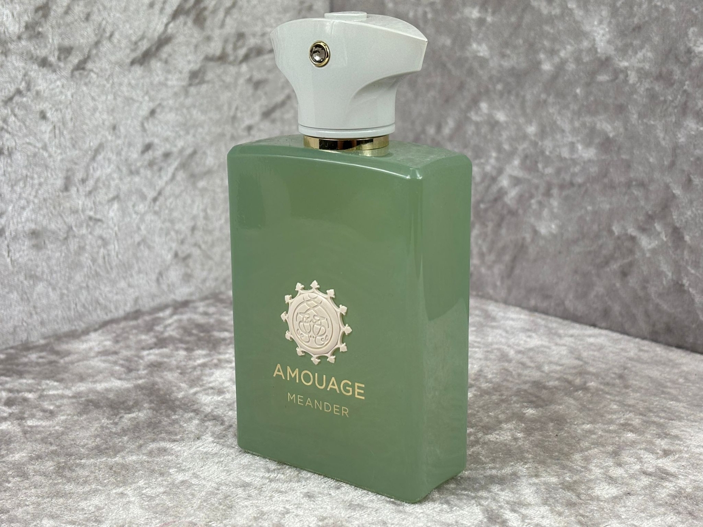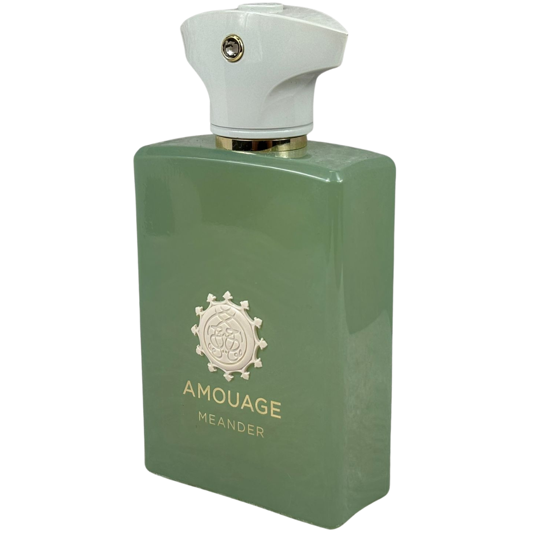 A 100ml bottle of Amouage Meander Eau De Parfum, an evocative and atmospheric fragrance inspired by shifting landscapes and moments of reflection. It opens with a fresh yet intriguing blend of citrus and subtle carrot seed, delivering a crisp and slightly earthy introduction that immediately sets it apart.