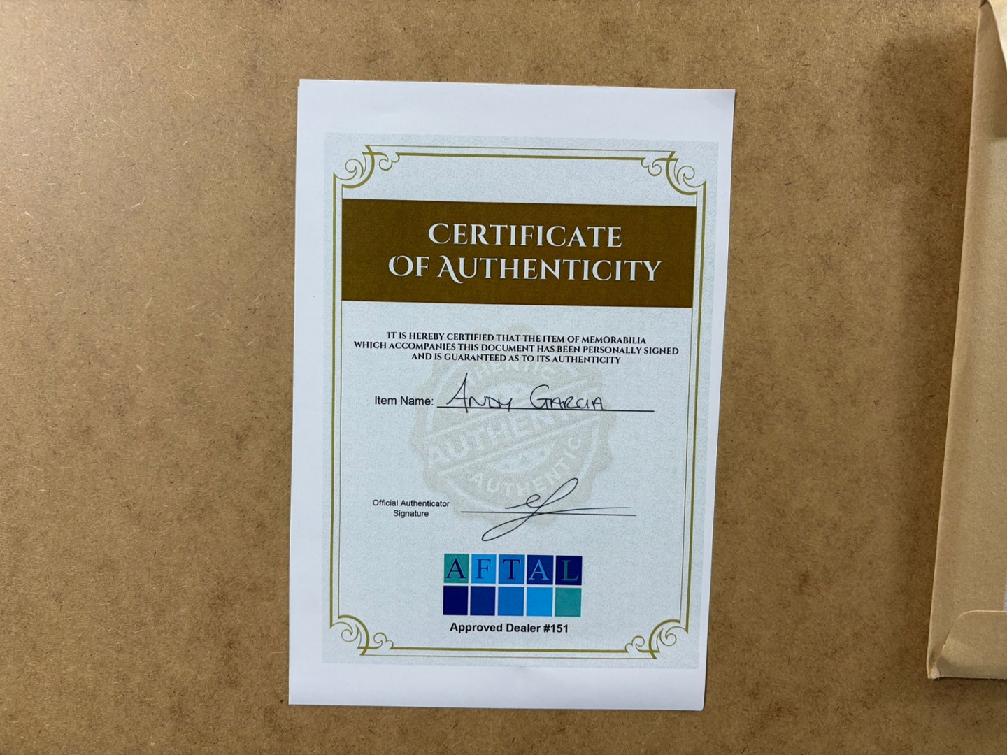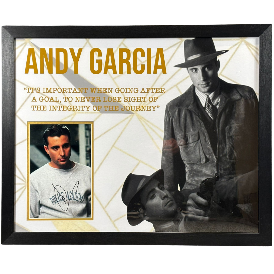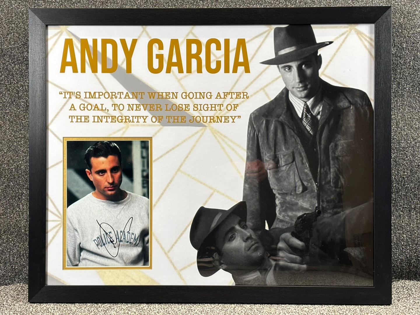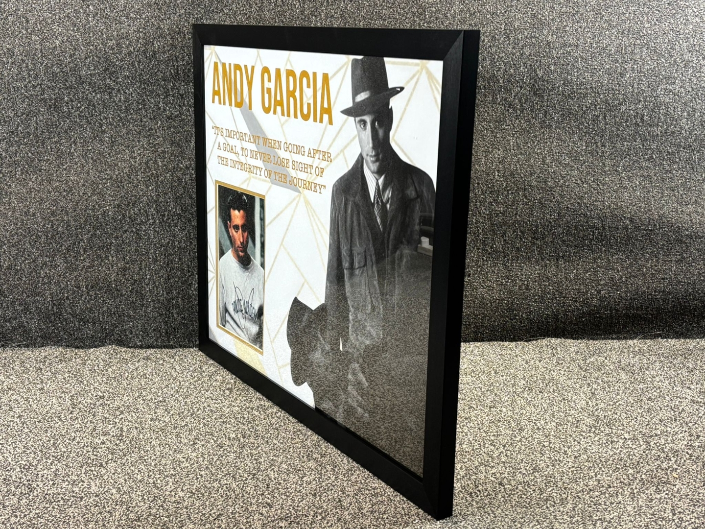 A signed and authenticated Andy Garcia Movie Picture in a presentation frame. Approx 68cm height, 83cm width.