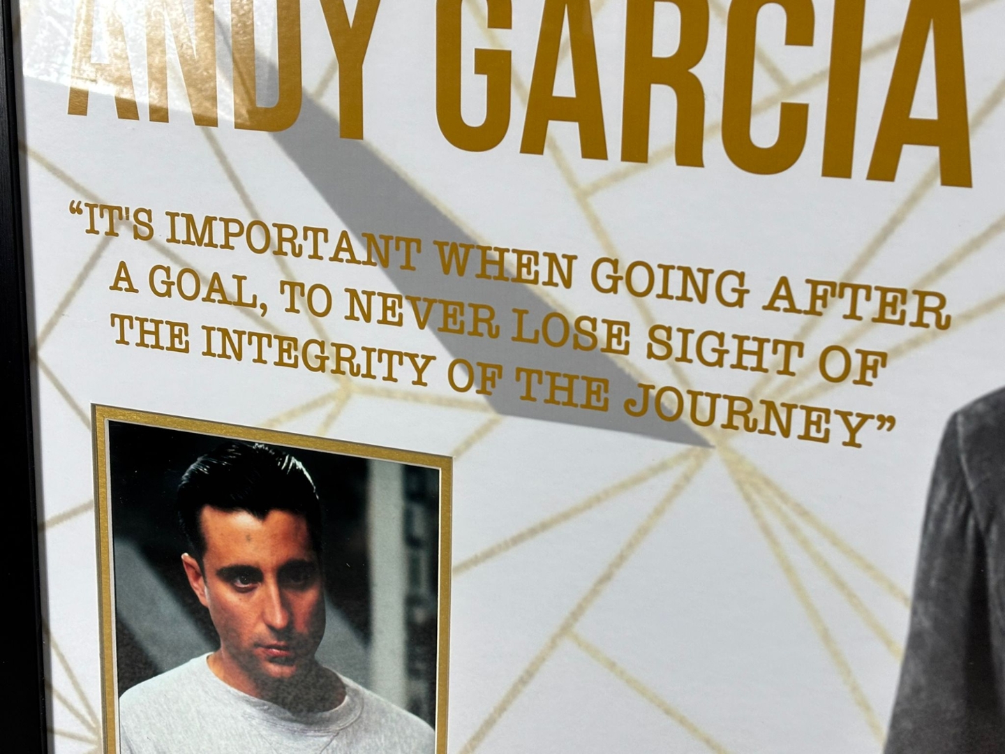 The display features a striking collage of images from Garcia’s memorable film roles, highlighted by an inspirational quote: “It’s important when going after a goal, to never lose sight of the integrity of the journey.” His autograph is neatly presented within the composition, adding genuine collectable value for fans and film enthusiasts alike.