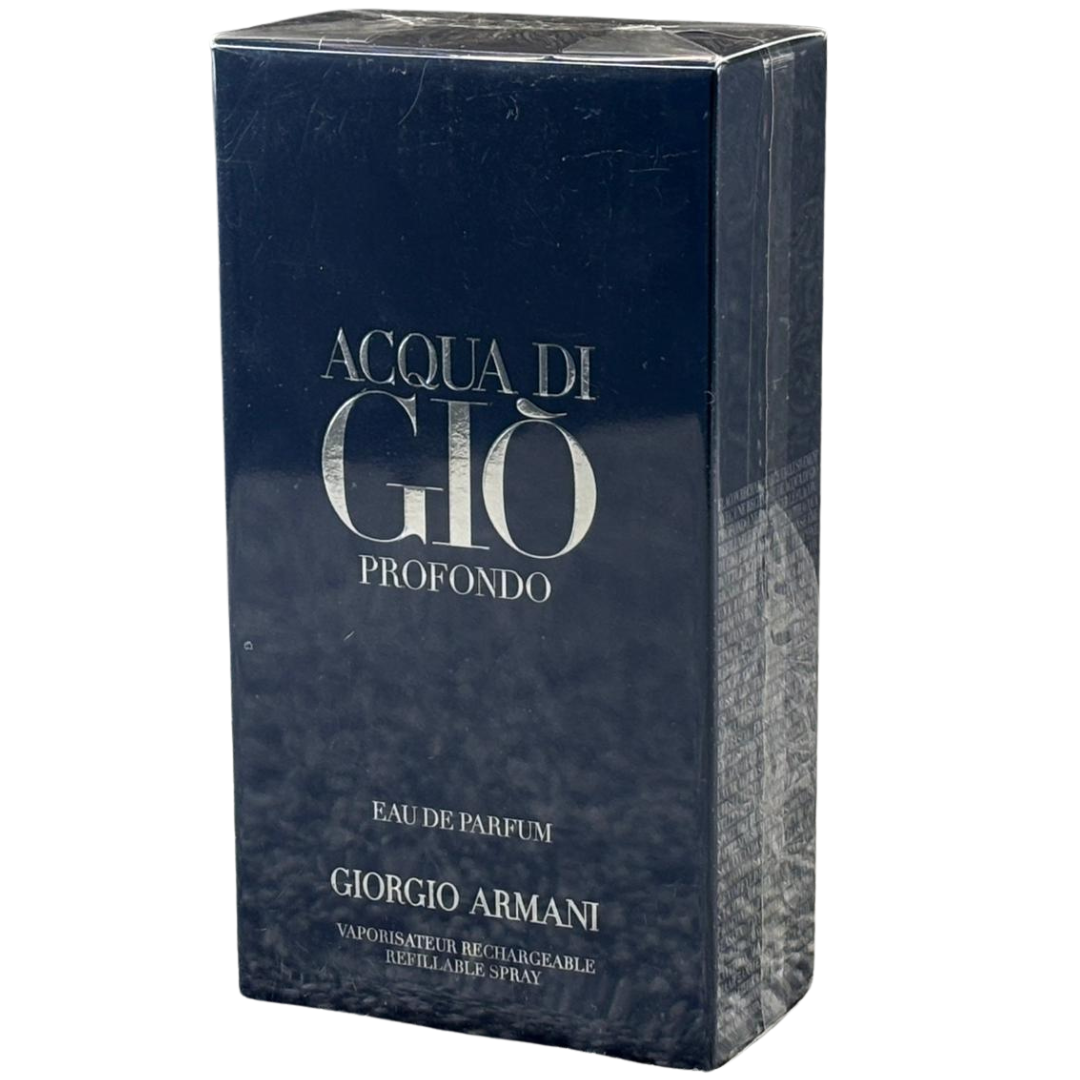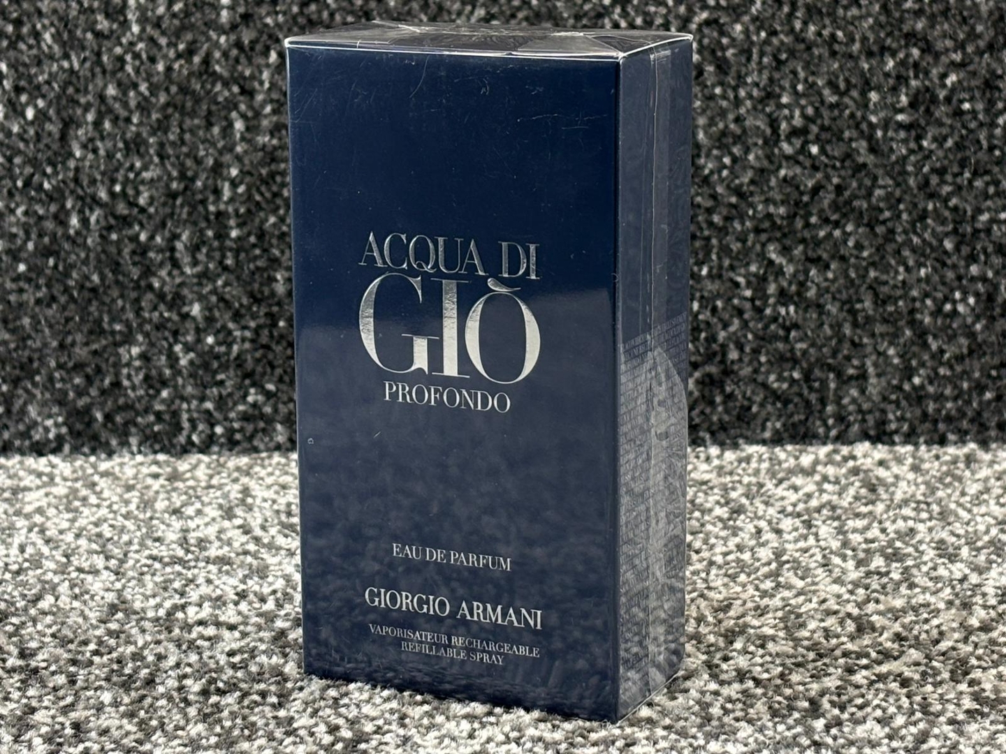 A 100ml bottle of Armani Acqua Di Gio Profondo Eau De Parfum, presented in its original presentation box and offering a deeper, more intense interpretation of the iconic Acqua Di Gio fragrance. Inspired by the depths of the sea, this modern release reflects strength, freshness and refined masculinity with a contemporary edge.