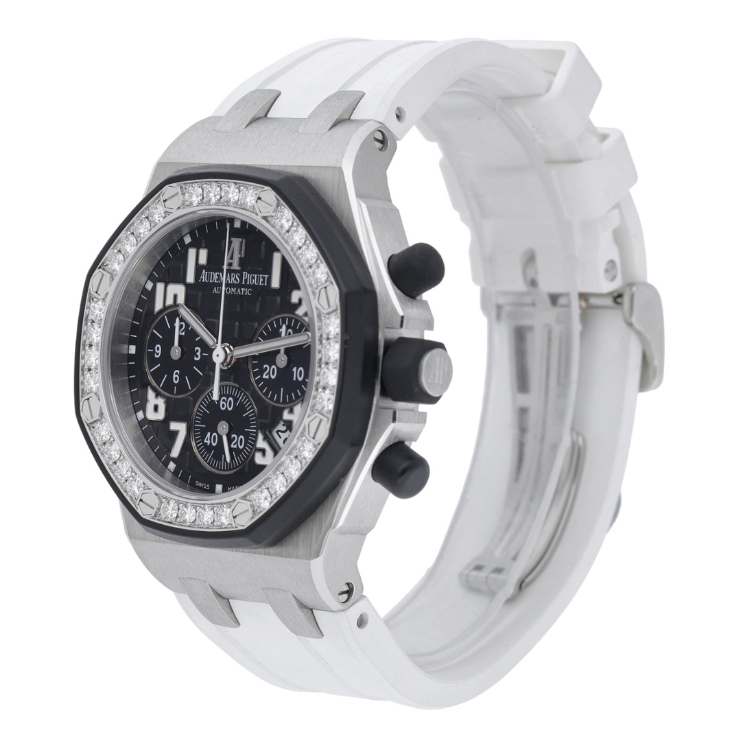 An Audemars Piguet Royal Oak Offshore watch, model 26470IO.OO.A006CA.01, presented on a white rubber strap with a stainless steel case and clasp. The bold 42mm Offshore case retains the collection’s unmistakable octagonal profile, enhanced here by a striking diamond-set bezel that adds an elevated level of luxury to the robust sports design. The black “Méga Tapisserie” dial features luminous Arabic numerals, three chronograph sub-dials, and a date aperture at 4-5 o’clock, creating a balanced yet highly legible layout.