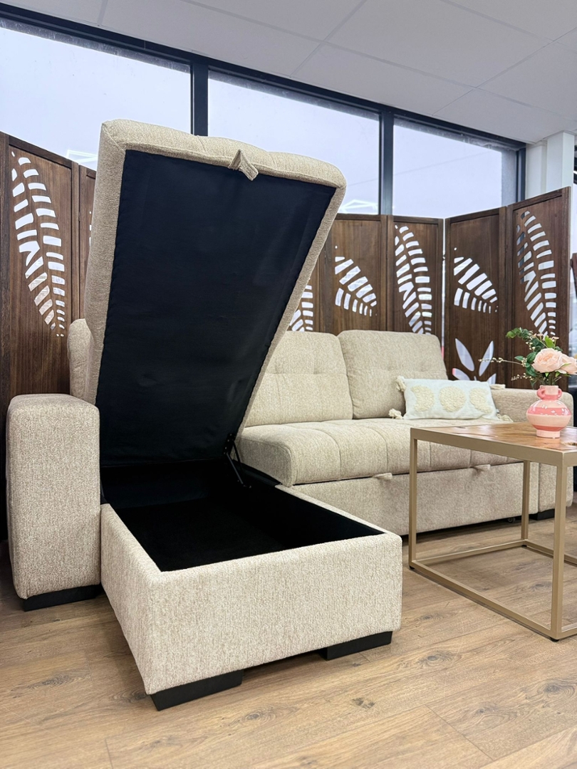 A beige sofa bed offers a clean, contemporary look, finished in a soft, textured upholstery that complements a wide range of interior styles. Set on subtle black legs, the design feels balanced and modern, with broad armrests and neatly structured back cushions creating a strong yet inviting silhouette. Its neutral tone makes it easy to style, while the generous chaise section adds visual depth and everyday comfort.