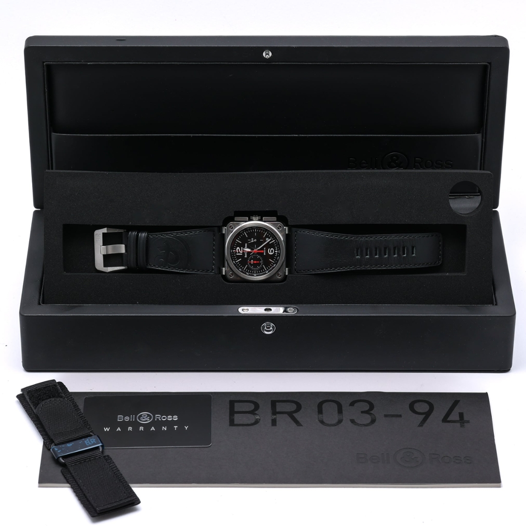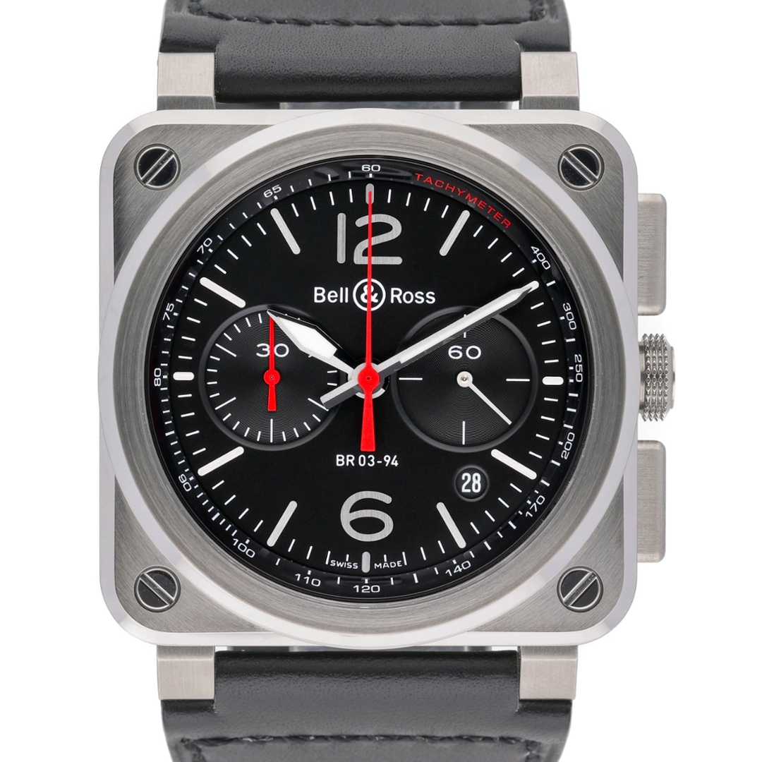 A Bell & Ross BR 03-94 presents the brand’s signature aviation-inspired design in a bold 42mm stainless steel square case, paired with a black dial and black leather strap. The high-contrast layout is immediately legible, with oversized Arabic numerals, luminous hands, and crisp chronograph sub-dials framed by the instrument-panel aesthetic that defines the BR 03 collection.