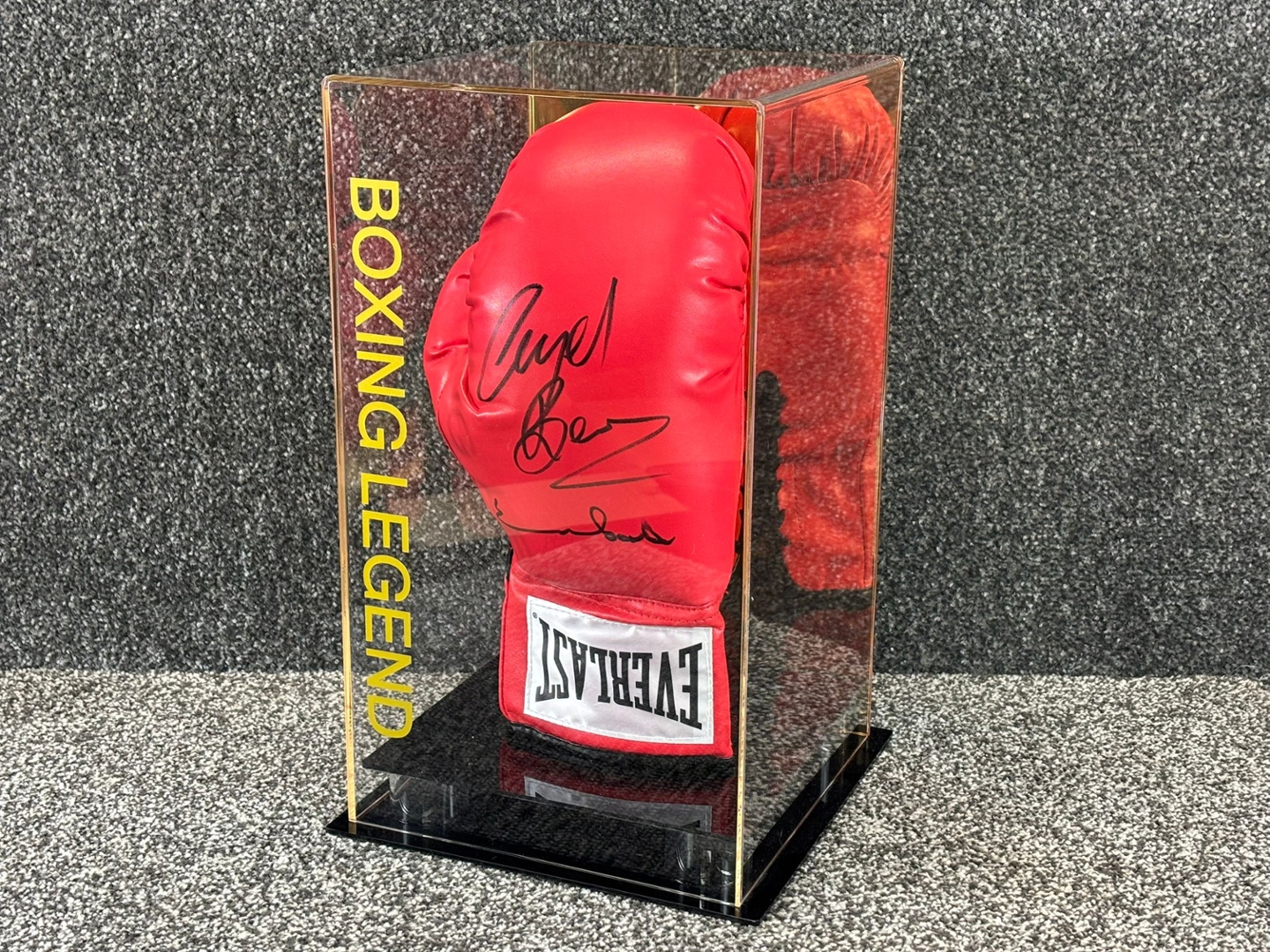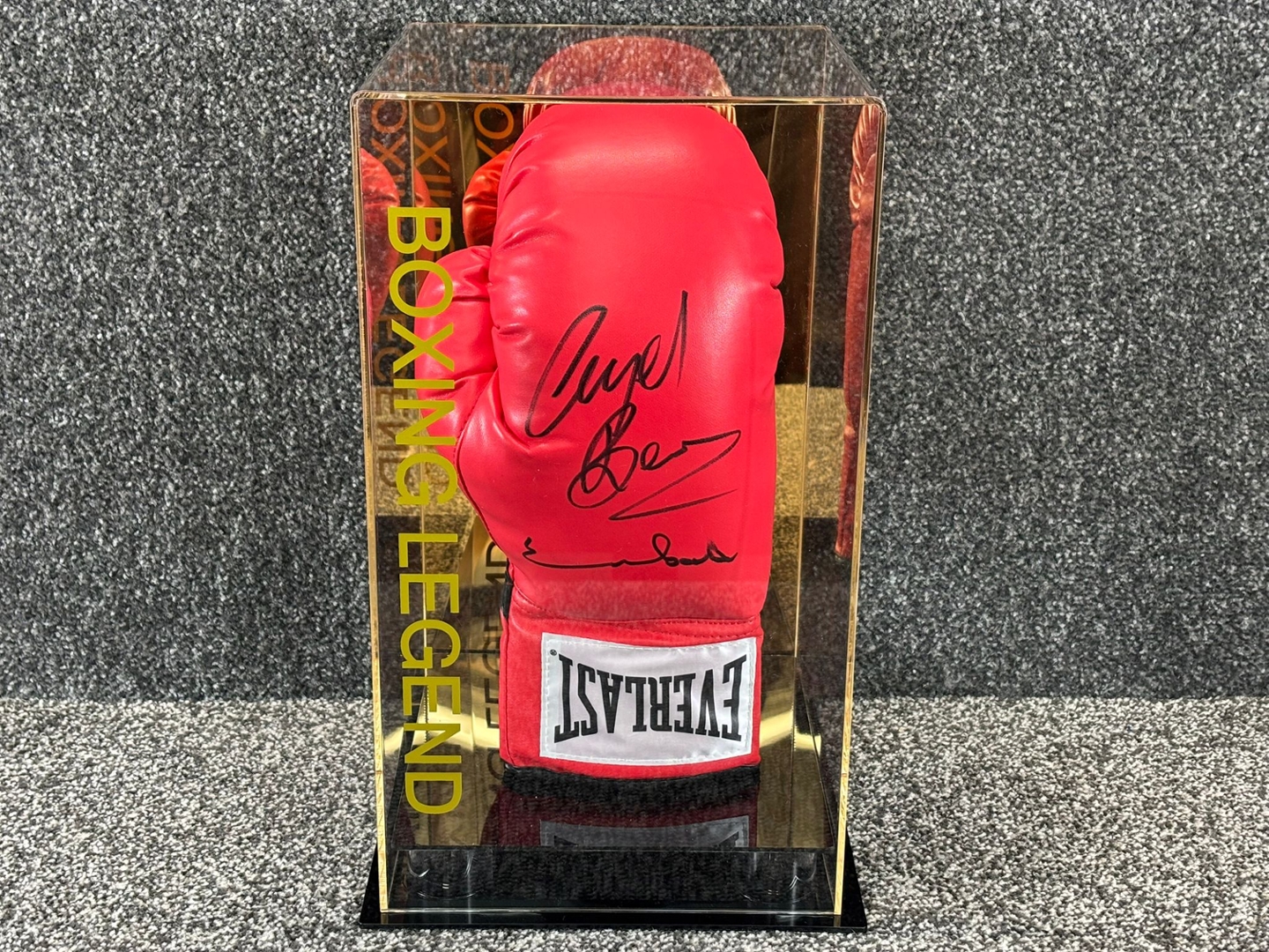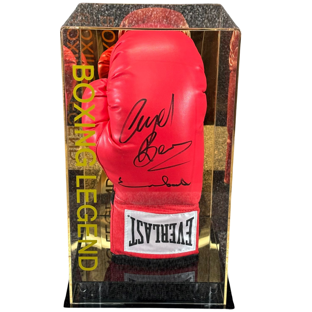 Presented within a clear display case, the glove is designed for both protection and visual impact. The case measures approximately 15 inches in height and 9 inches in width, allowing the vivid red glove and bold signatures to be viewed clearly from all angles. The Everlast branding adds further authenticity and sporting relevance to the piece.