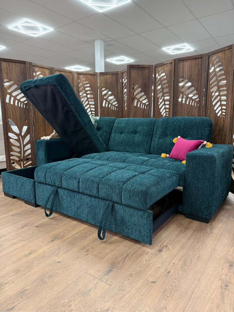 Designed for versatility, the sofa effortlessly converts into a sofa bed, providing a practical sleeping solution for guests. Integrated within the chaise is a lift-up storage compartment, ideal for storing bedding, cushions or seasonal items. The mechanism is discreetly incorporated, allowing the piece to maintain its streamlined appearance while offering valuable hidden storage.