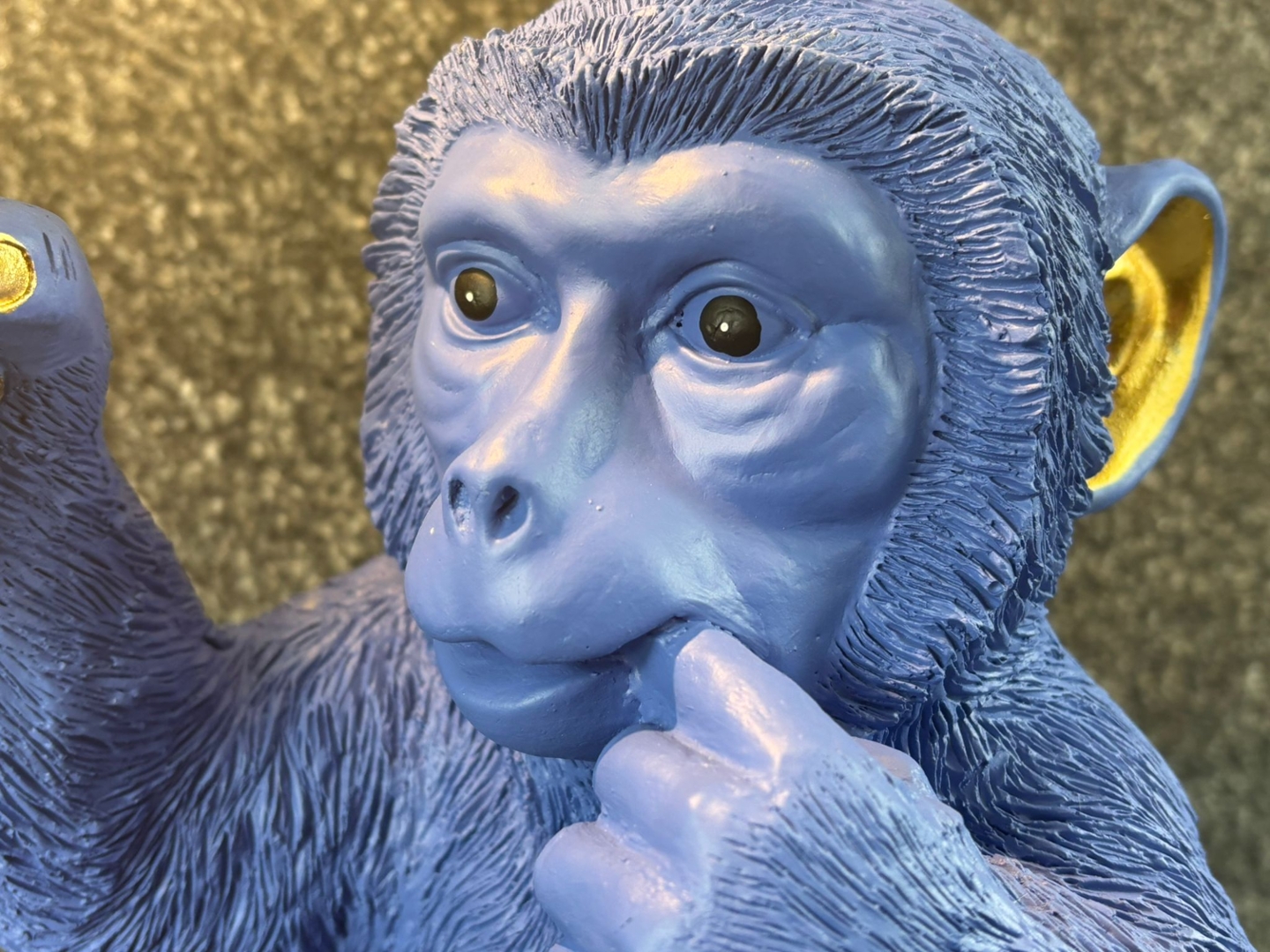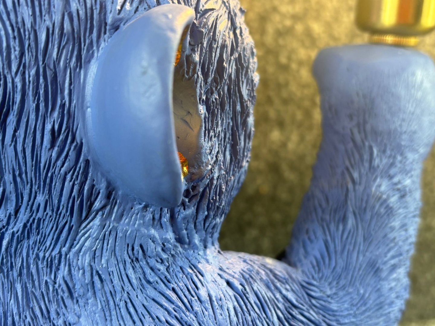 A blue sitting chimp table lamp that combines playful character with functional design. Crafted with attention to detail, the lamp features a seated chimp holding a brass-toned fitting with an exposed bulb, creating a striking and whimsical look. The textured surface captures the fur and features of the chimp, while the bold blue finish adds a modern and artistic twist. This unique piece is designed not just to illuminate but also to serve as a conversation starter in any setting.