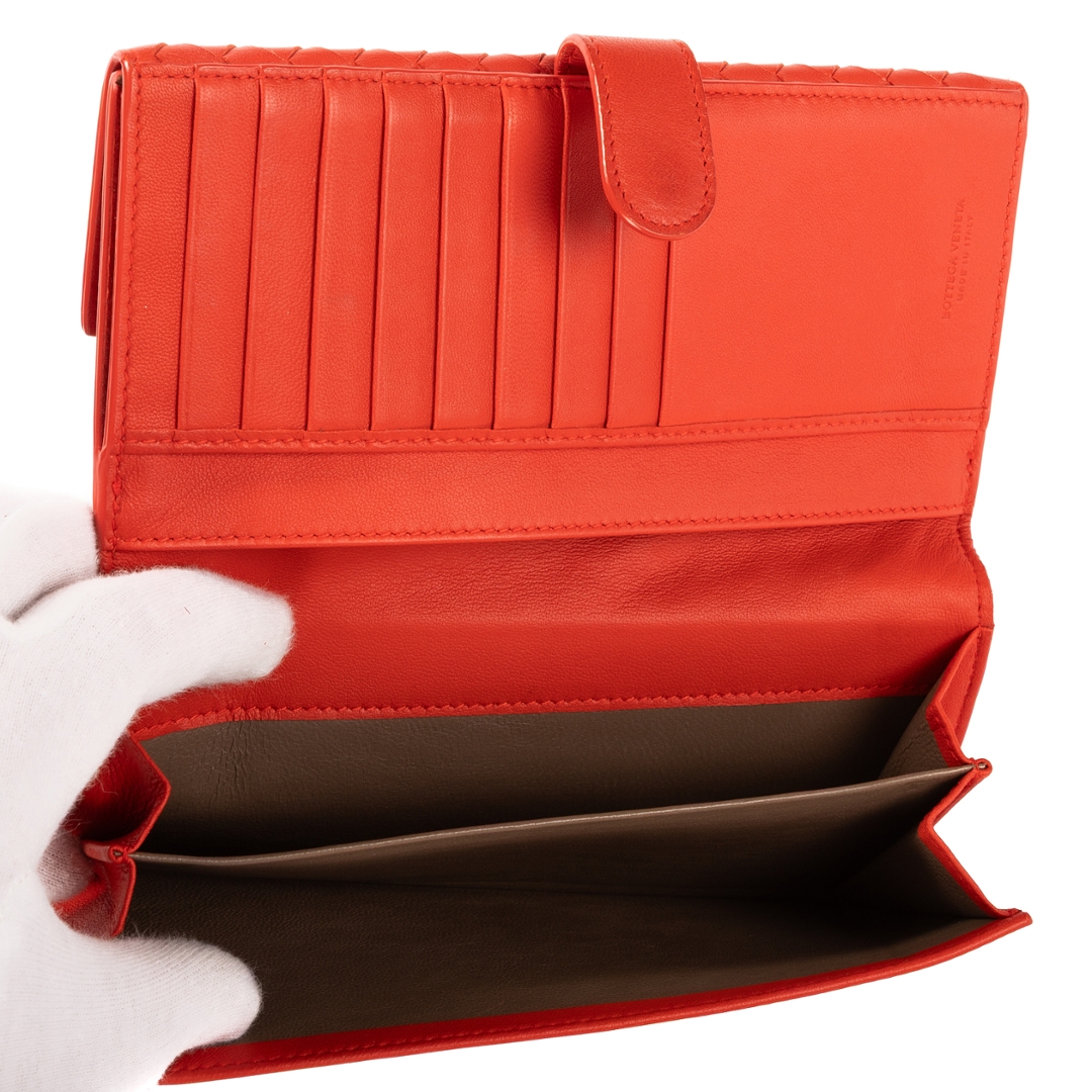 A vintage Bottega Veneta orange calf leather Intrecciato Long Wallet that showcases the brand’s unmistakable craftsmanship and timeless design. Expertly woven in the signature Intrecciato technique, this wallet exemplifies Bottega Veneta’s mastery of understated luxury. The vibrant orange hue adds a contemporary edge to the classic silhouette, making it both a stylish statement and a versatile everyday accessory.