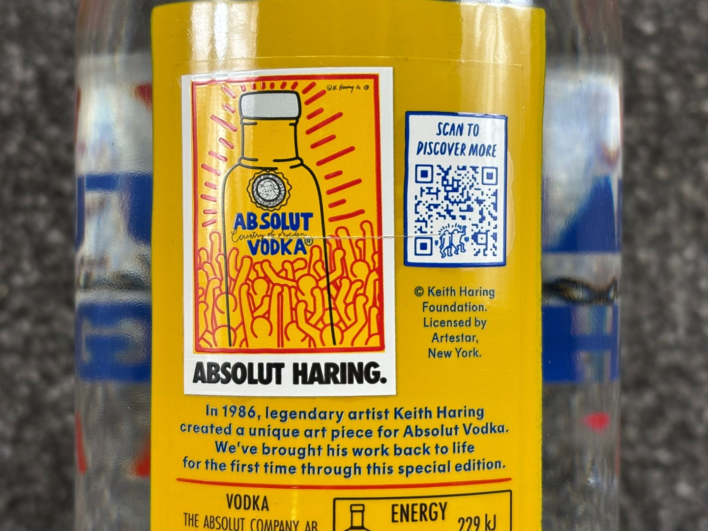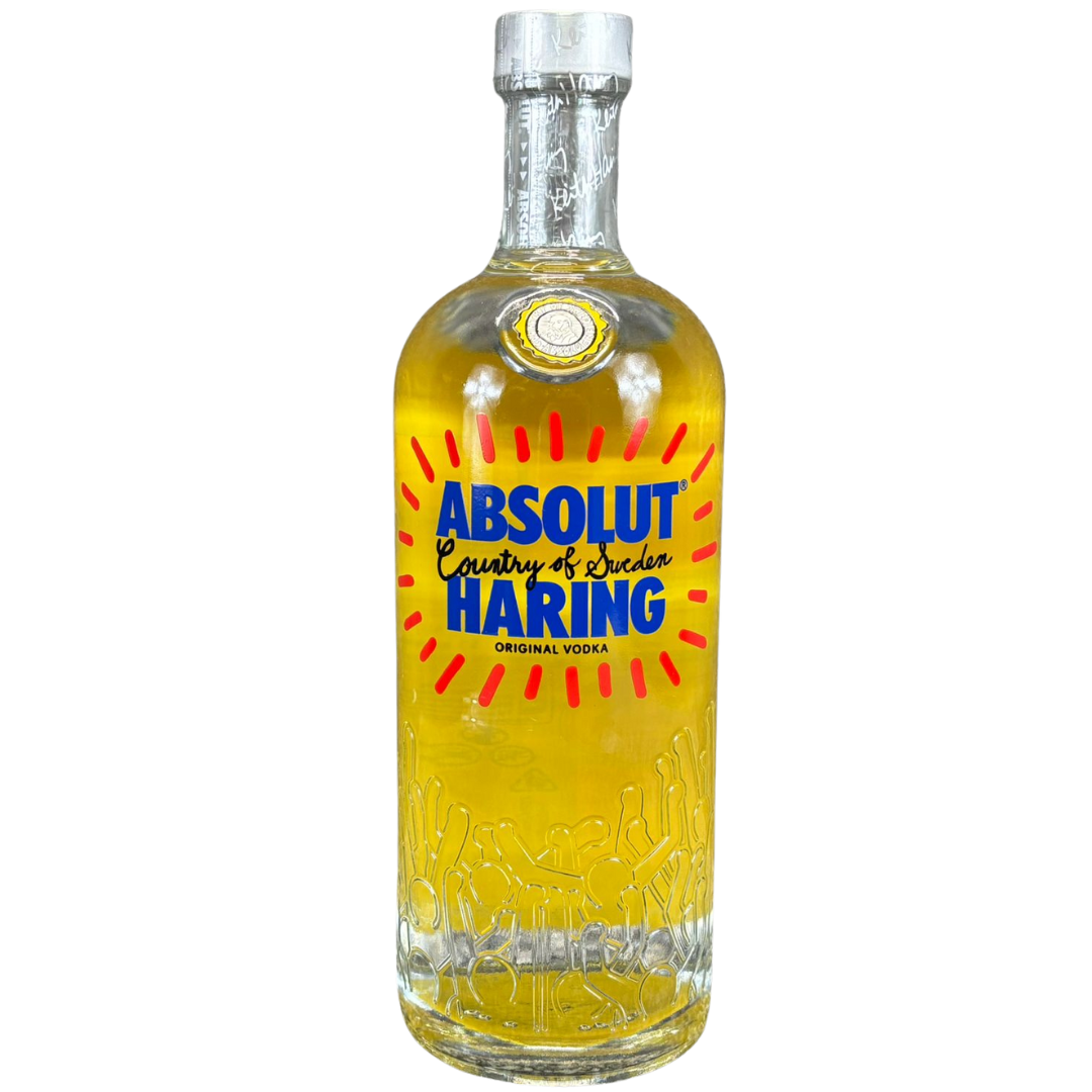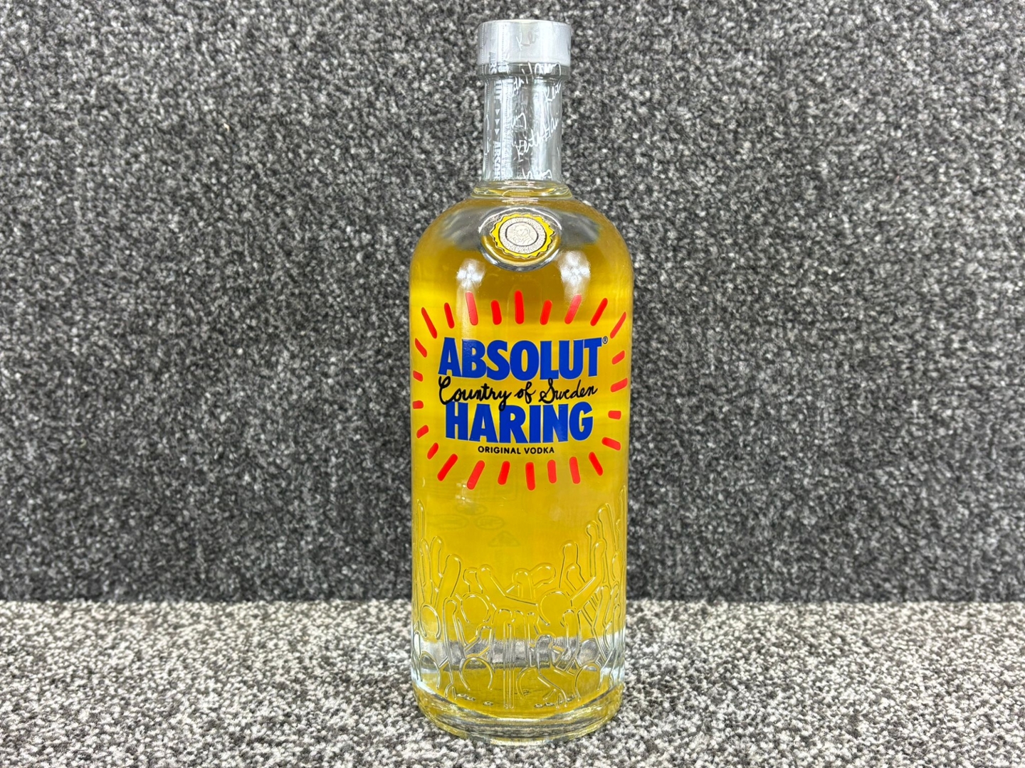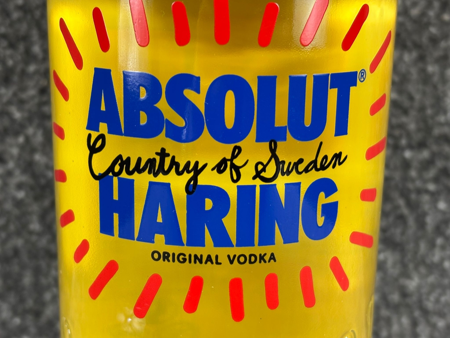 A 1L bottle of Absolut Haring Vodka is a rare collector’s edition that celebrates the creative collaboration between Absolut and iconic pop artist Keith Haring. Known for his bold, radiant artwork, Haring’s unmistakable style is vividly captured here with the energetic red and blue design radiating from the brand’s signature clear glass bottle. The bottom of the bottle features embossed dancing figures—an homage to Haring’s joyful and inclusive artistic spirit.