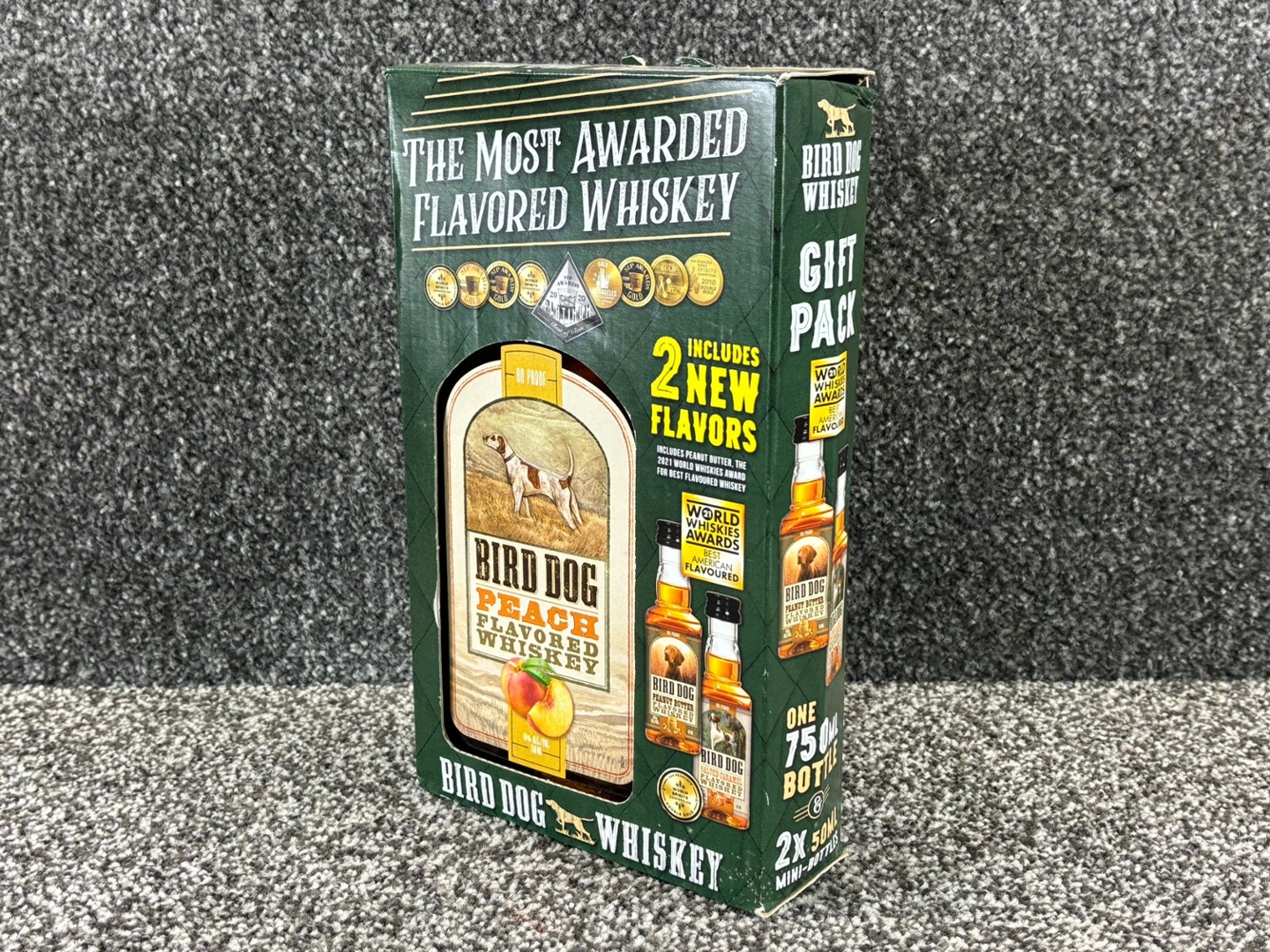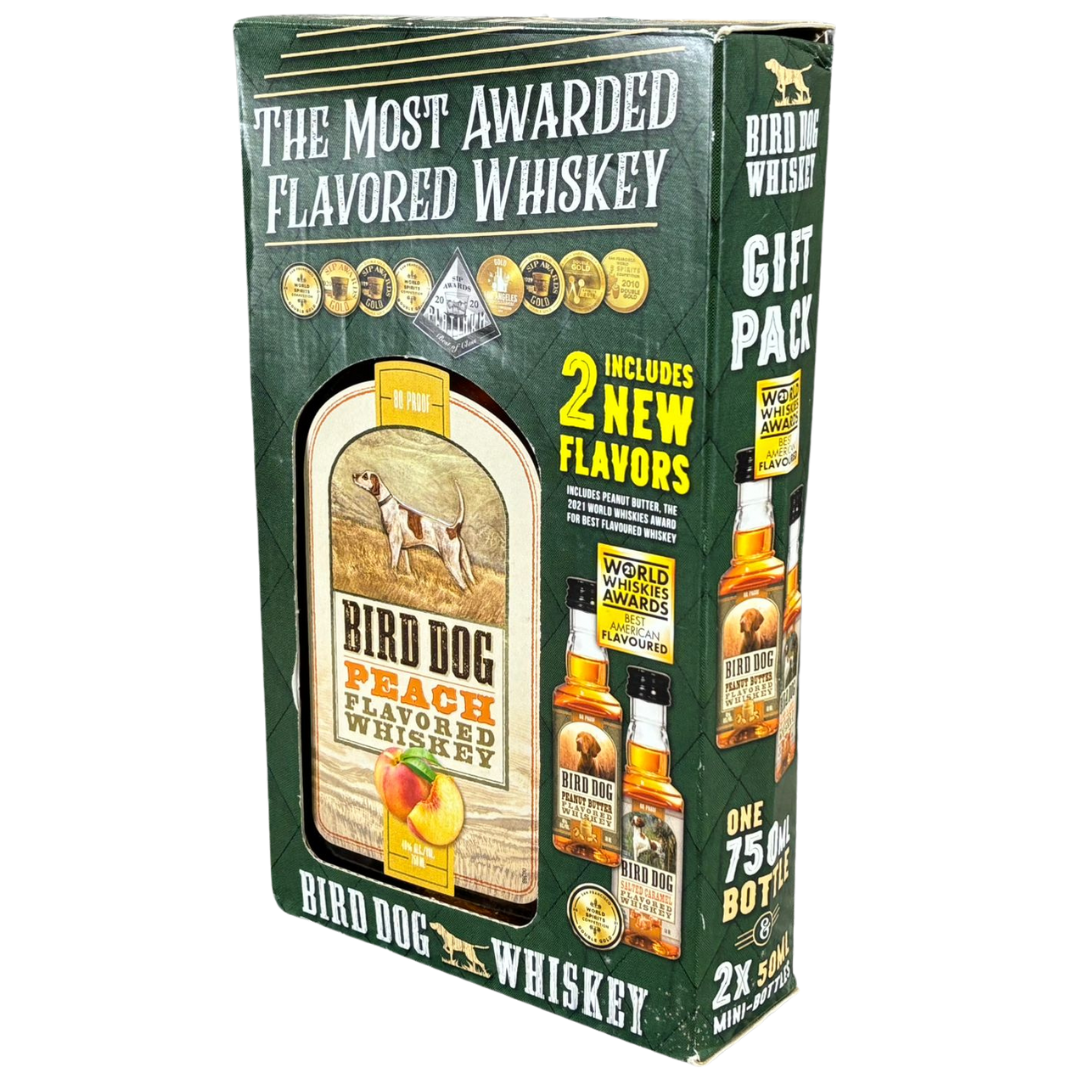 A 750ml bottle of Bird Dog Peach Flavoured Whiskey, presented in an award-winning gift set complete with two miniature bottles showcasing extra flavours from the Bird Dog range. This pack highlights why Bird Dog is celebrated as one of the most decorated flavoured whiskey producers in the world, with medals displayed proudly across the box. The main bottle captures their signature Peach expression – smooth, sweet and bursting with ripe, juicy peach character layered over warm, approachable whiskey.