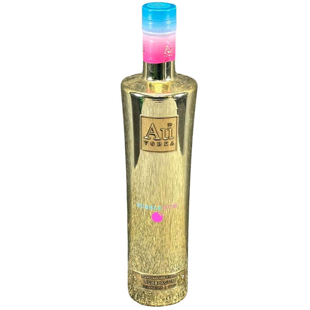A 70cl bottle of AU Vodka Bubblegum is instantly eye-catching with its signature gold chrome bottle paired with a vibrant blue-to-pink gradient neck, perfectly matching the playful flavour inside. Bold, modern and unapologetically stylish, it captures attention immediately and brings a fun, colourful edge to any drinks collection or party setup. The clean embossed branding and minimal text keep the look premium despite its vibrant theme.