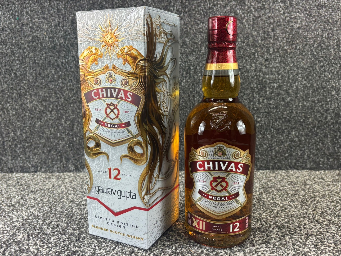 A bottle of Chivas Regal 12-Year-Old Limited Edition Whisky offers a refined take on the world-famous blend, presented here in a striking 70cl release. The packaging features an exclusive Gaurav Gupta design, adding a sense of modern artistry to the heritage of Chivas. Its deep amber whisky is visible through the classic bottle shape, giving an immediate impression of richness and warmth.