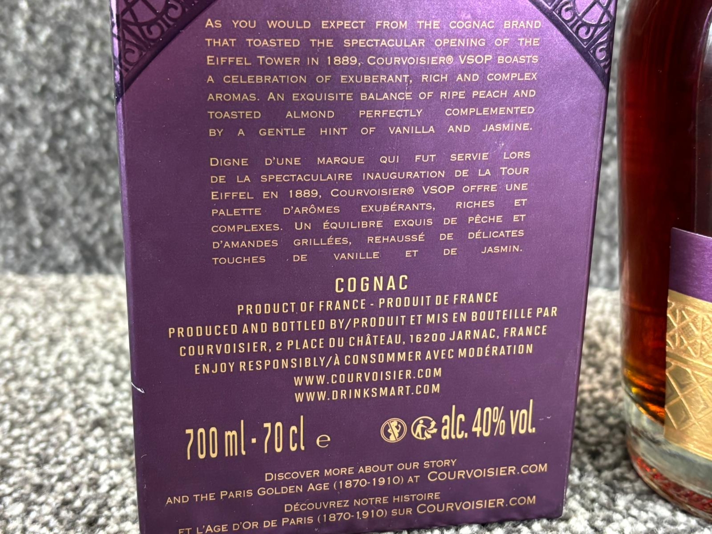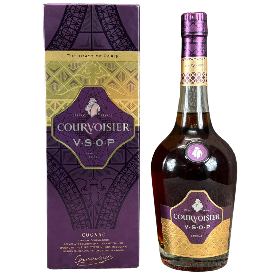 A 70cl bottle of Courvoisier VSOP Cognac, presented in its elegant purple and gold presentation box exactly as shown in the image. The packaging features the signature Courvoisier crest, embossed detailing and the “Le Toast de Paris” banner, all matching perfectly and giving it a luxurious, gift-ready appearance. The design draws inspiration from the Eiffel Tower, reinforcing the brand’s deep French heritage.