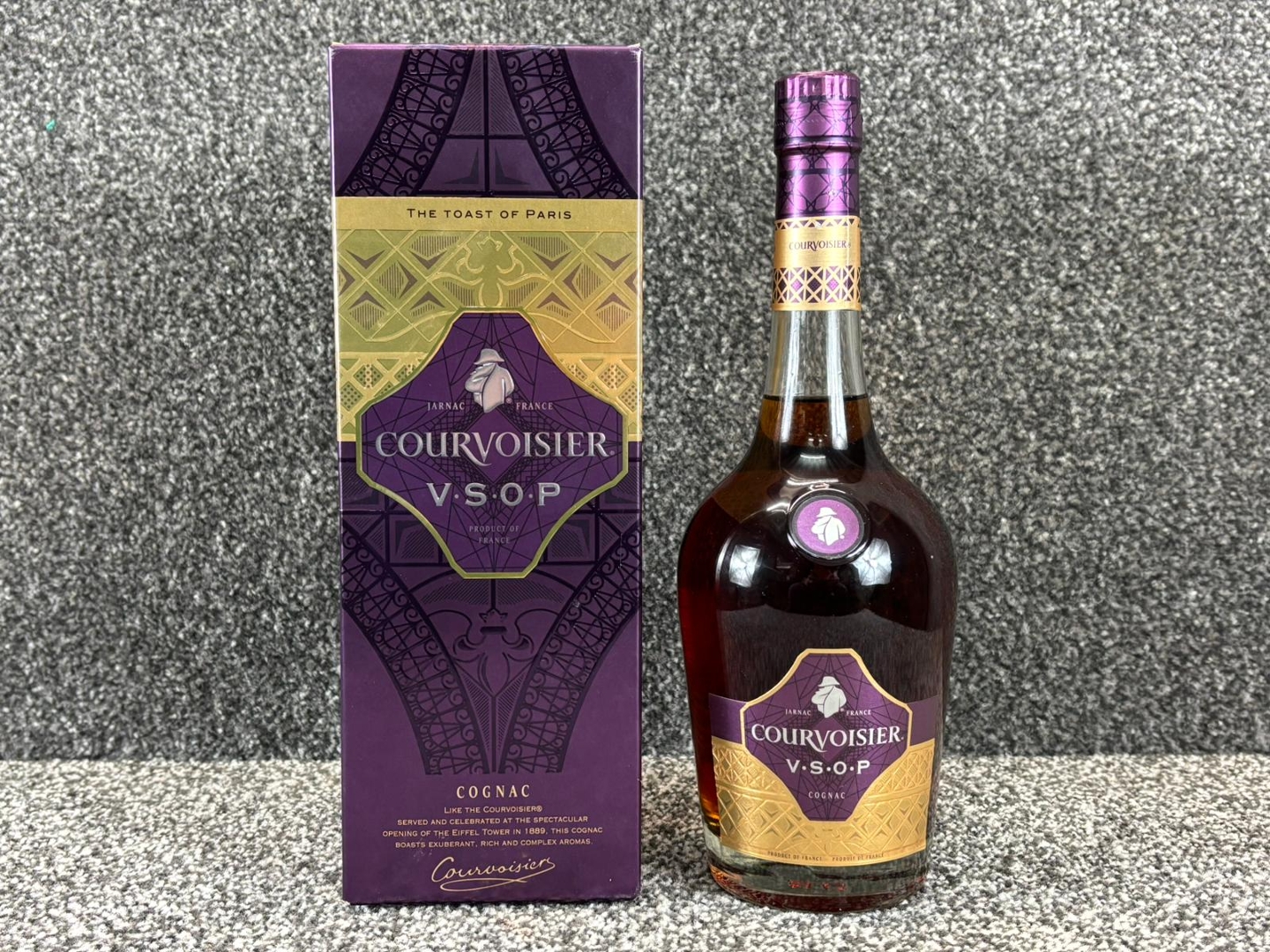 A bottle of Courvoisier VSOP Cognac in a presentation box. 70cl.