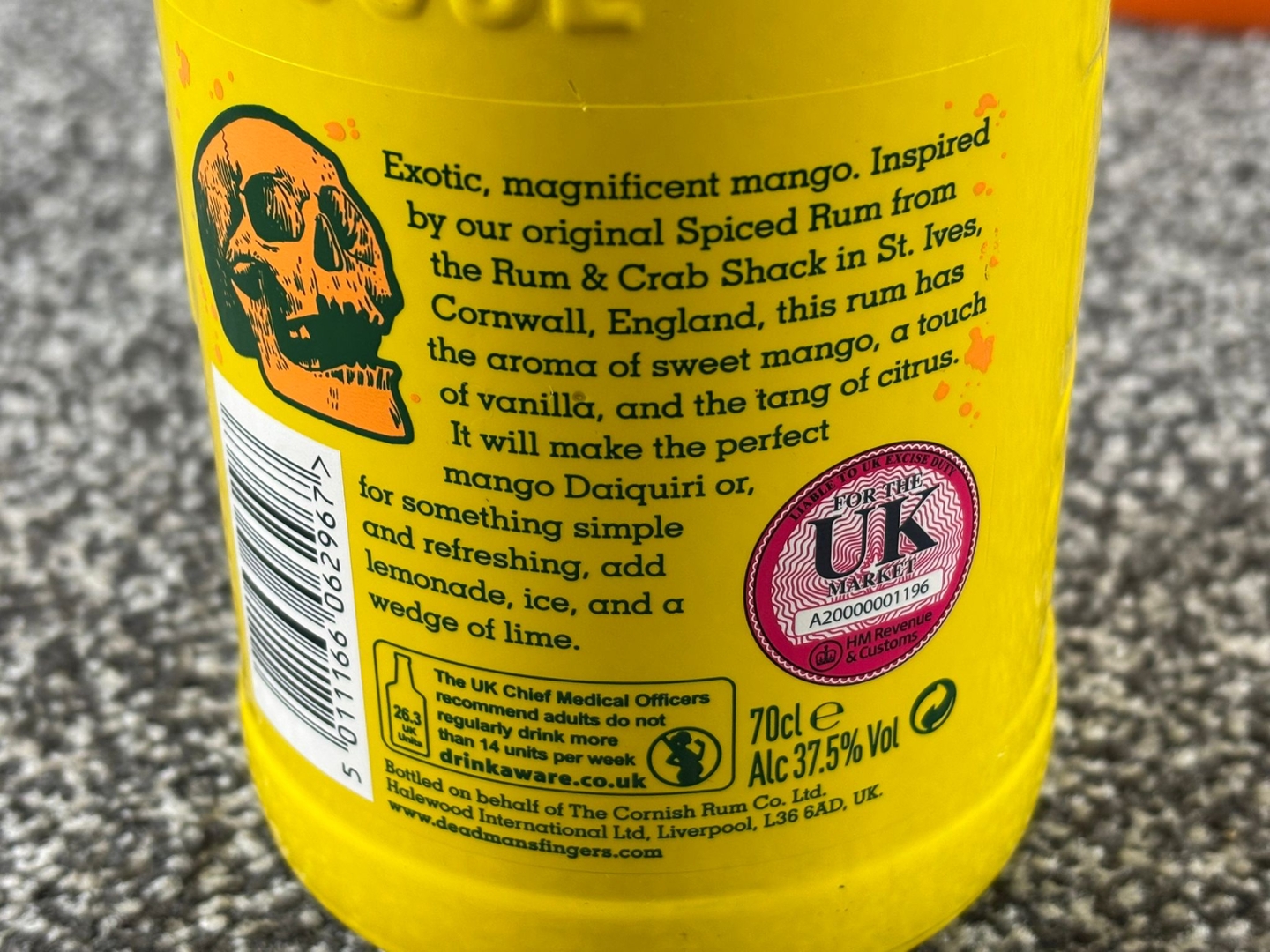 - > Bottle of Dead Man's Finger's Mango Rum.