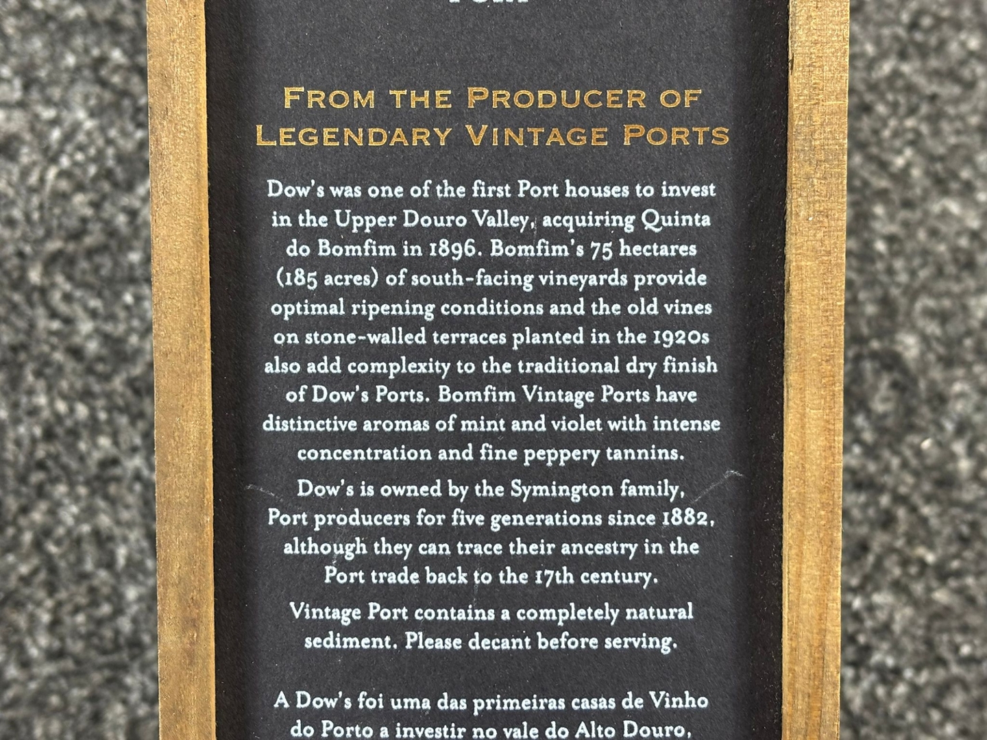 A 75cl bottle of Dow’s Quinta do Bomfim Vintage Port, beautifully presented in its original wooden display box and showing all the hallmarks of a premium, cellar-worthy Portuguese classic. This 2006 vintage comes from one of the Douro Valley’s most celebrated estates, Quinta do Bomfim, known for producing deeply structured, elegantly balanced ports with exceptional ageing potential.