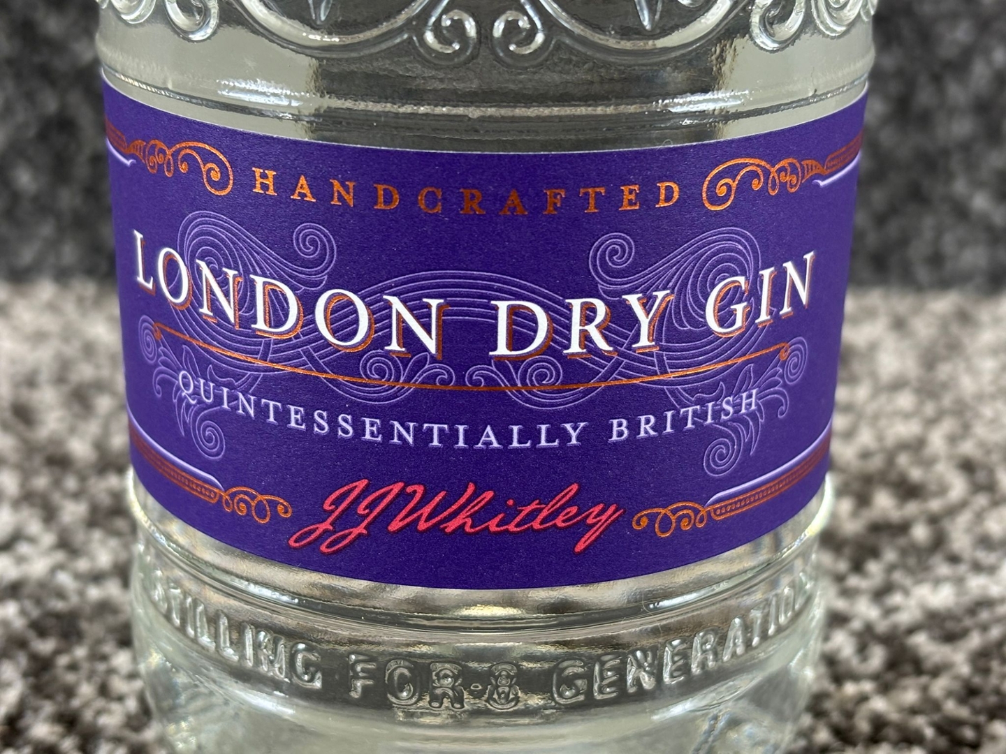 A 1 litre bottle of J.J. Whitley London Dry Gin, a classic,