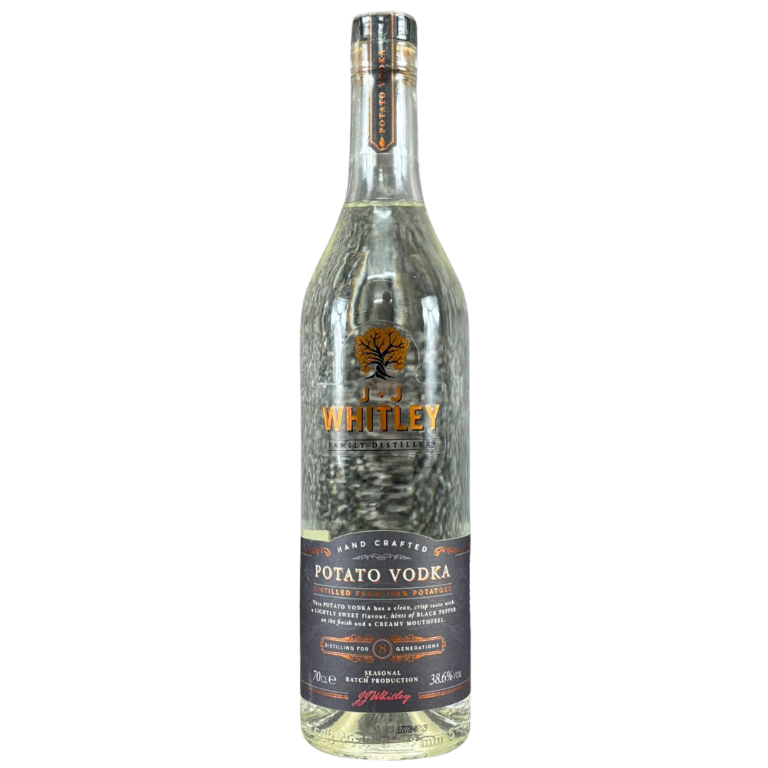 A bottle of J.J. Whitley Potato Vodka in the 70cl size, presented in a tall, elegant bottle that reflects the brand’s heritage and craftsmanship. The clear glass highlights the vodka’s purity, while the dark label and gold detailing give it a premium, refined appearance. As part of the Whitley family distilling tradition, this expression showcases their focus on producing smooth, characterful spirits with meticulous attention to detail.