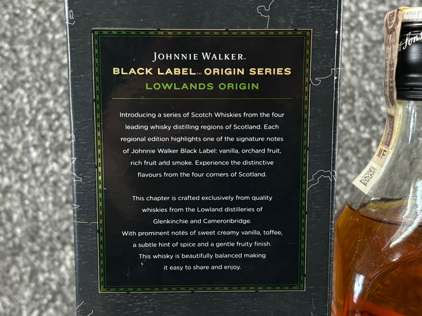 - > Bottle of Limited Edition Johnnie Walker Black Label Lowlands Origin Scotch Whisky.