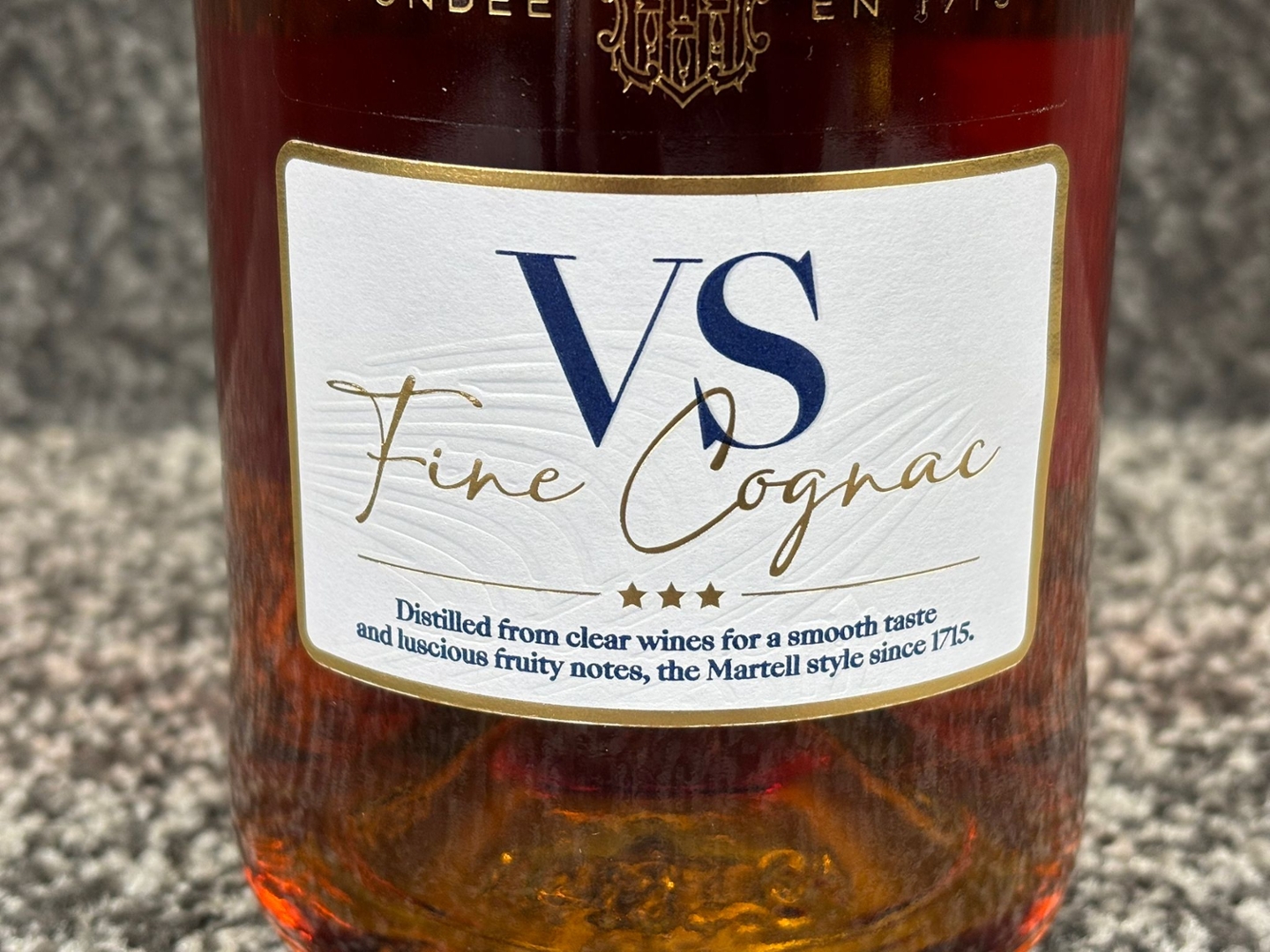 A bottle of Martell VS Fine Cognac, offering a refined introduction to one of the most established houses in Cognac. Founded in 1715, Martell is renowned for its elegant style, and this VS expression reflects that heritage with a bright amber tone and a clean, contemporary presentation that makes it ideal for both enjoyment and gifting.