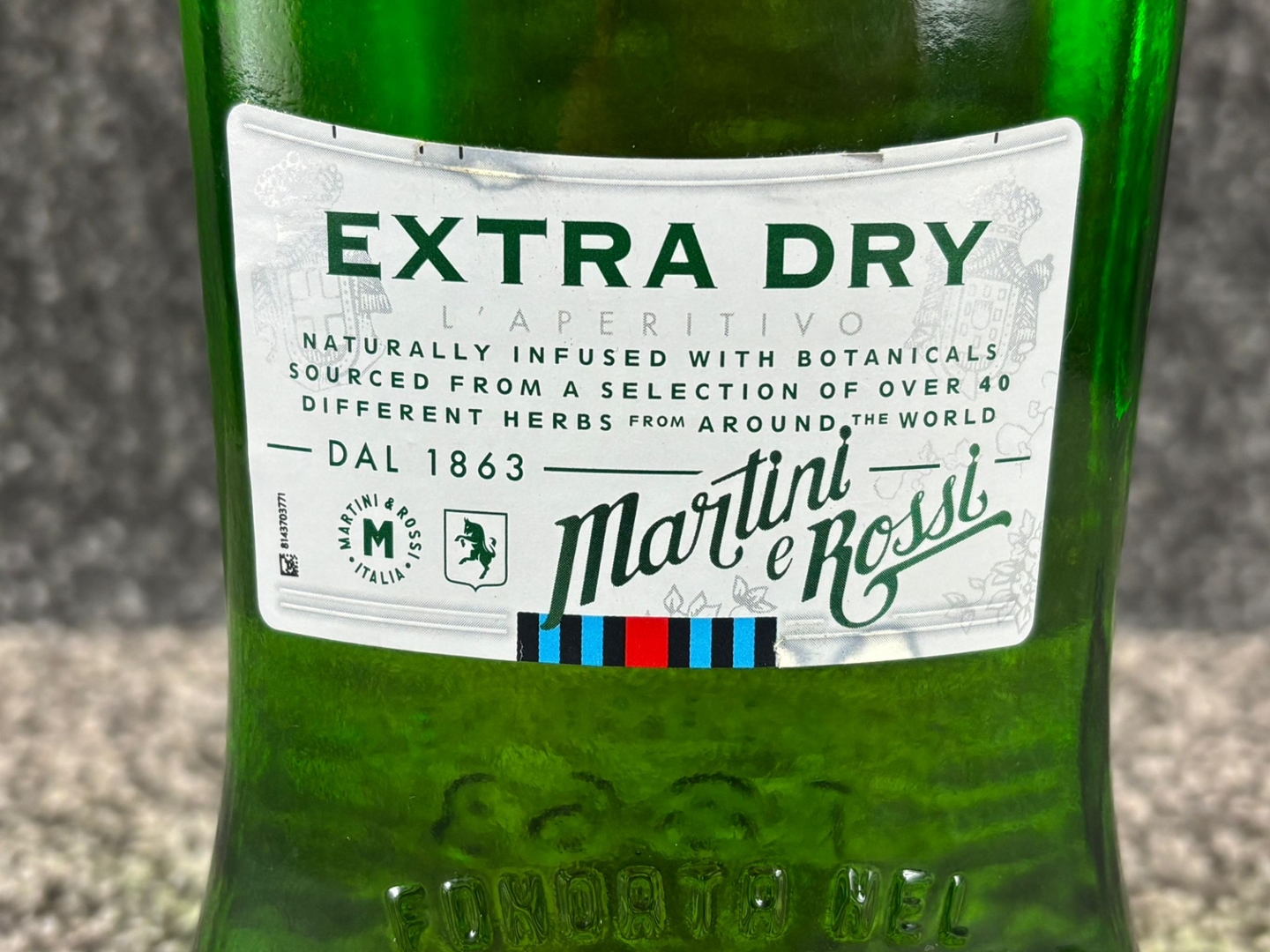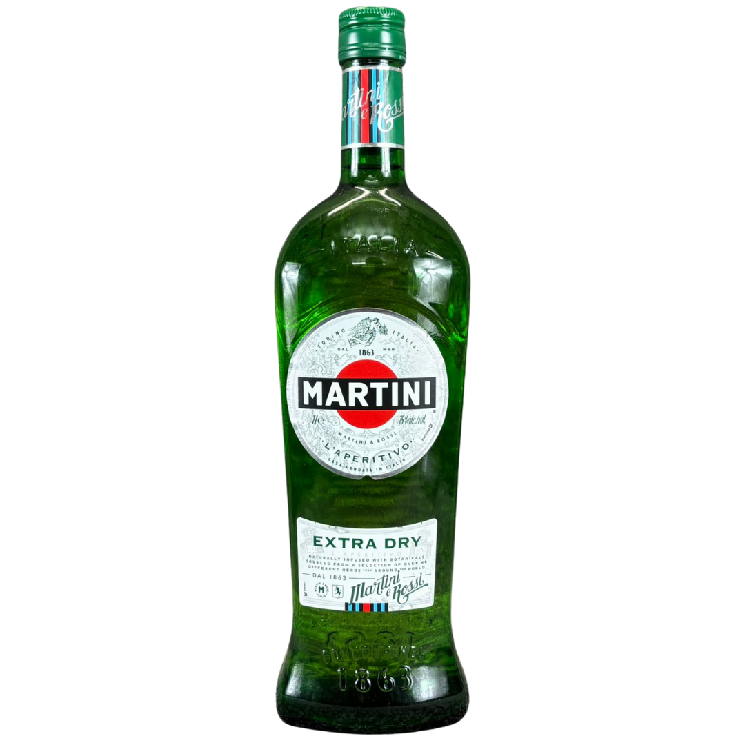 A 1-litre bottle of Martini Extra Dry, presented in its signature green glass with the classic Martini & Rossi branding exactly as shown in the image. This iconic Italian aperitif is celebrated for its crisp, aromatic character, offering a refined blend of citrus zest, delicate herbs and subtle floral notes that create its unmistakably dry, refreshing profile. The label and appearance in the image perfectly match the product described, including the distinctive embossed detailing on the glass and the Martini crest.