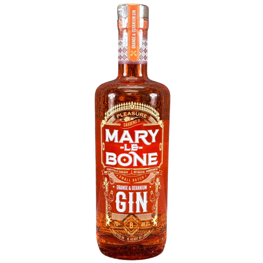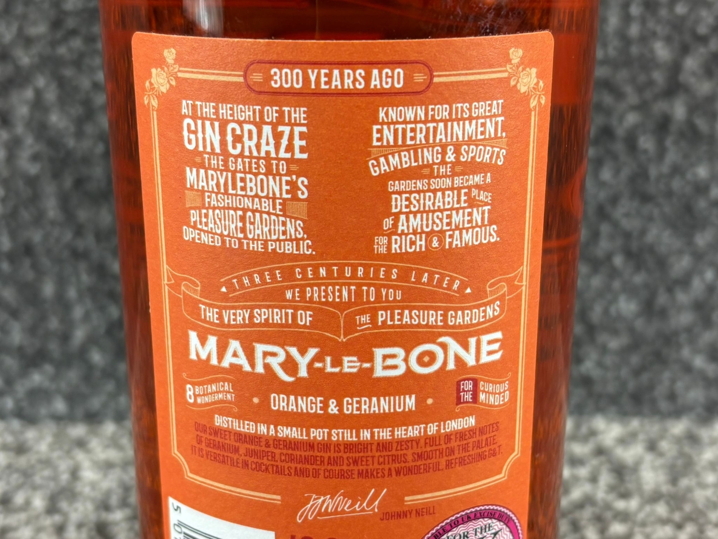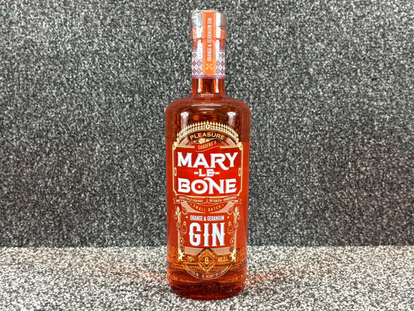A bottle of Mary-Le-Bone Orange & Geranium Gin. 70cl.