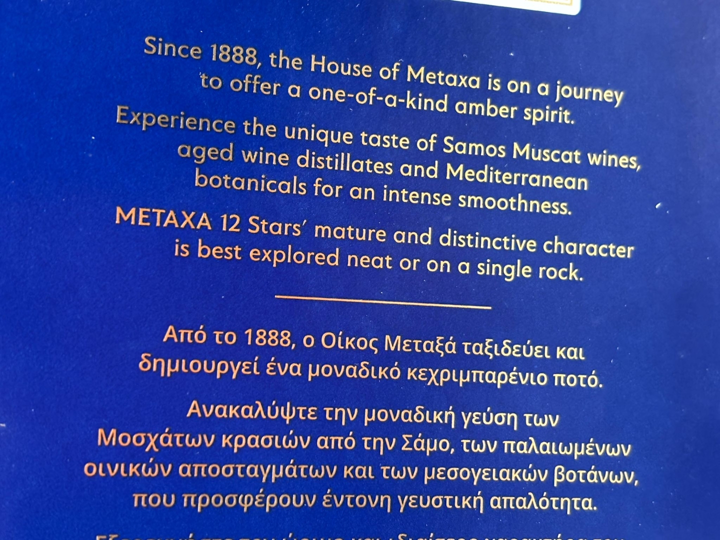 Inside is Metaxa’s signature blend, combining aged wine distillates, Muscat wines from the Aegean Islands and a carefully selected mix of Mediterranean botanicals. Expect rich, inviting aromas of dried fruit, honey and subtle spice. On the palate, it offers a smooth, warming profile with notes of vanilla, raisins and a gentle herbal edge, all wrapped in a soft, velvety texture that finishes long and beautifully rounded.