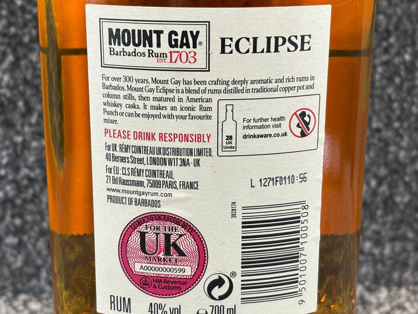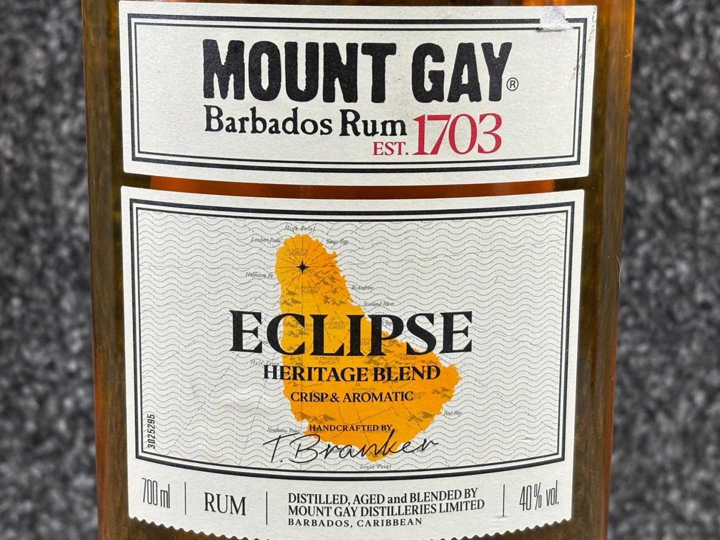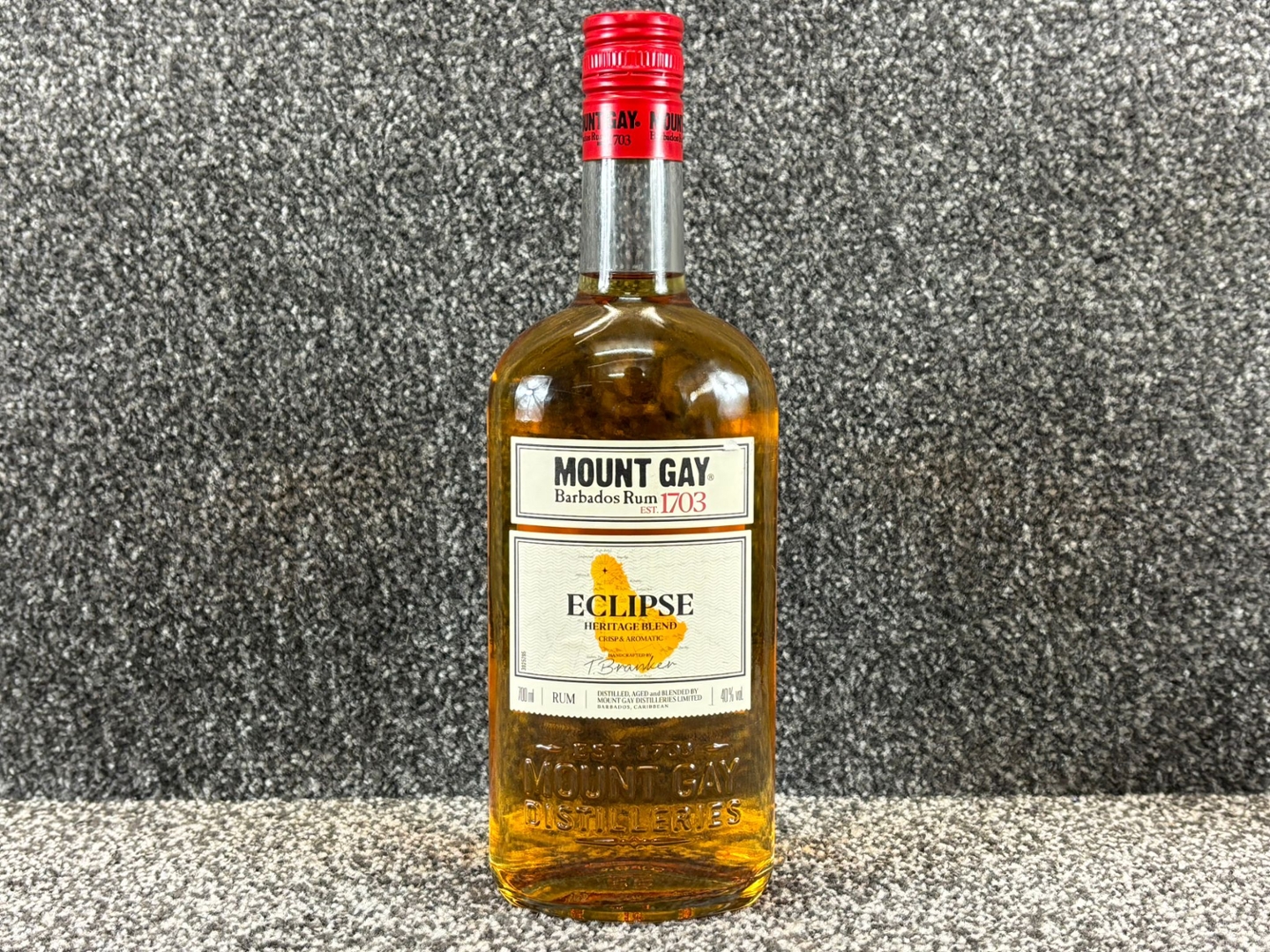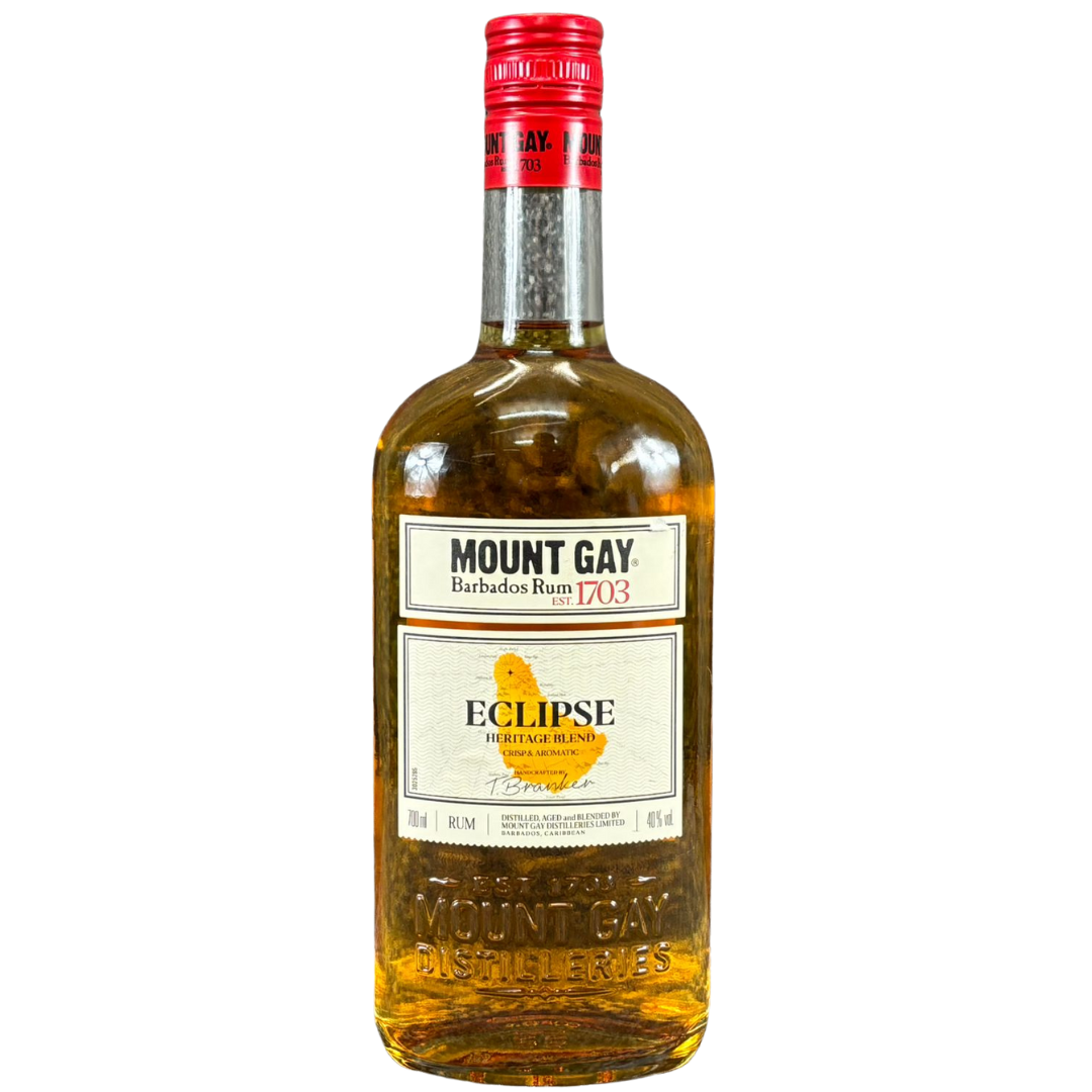 A 700ml bottle of Mount Gay Barbados Rum showcases the heritage and craftsmanship of the world’s oldest rum distillery, established in 1703. The classic bottle shape, embossed detailing and rich golden hue give it a timeless Caribbean character, while the clean label design highlights its Eclipse Heritage Blend — a crisp and aromatic expression beloved by rum enthusiasts.