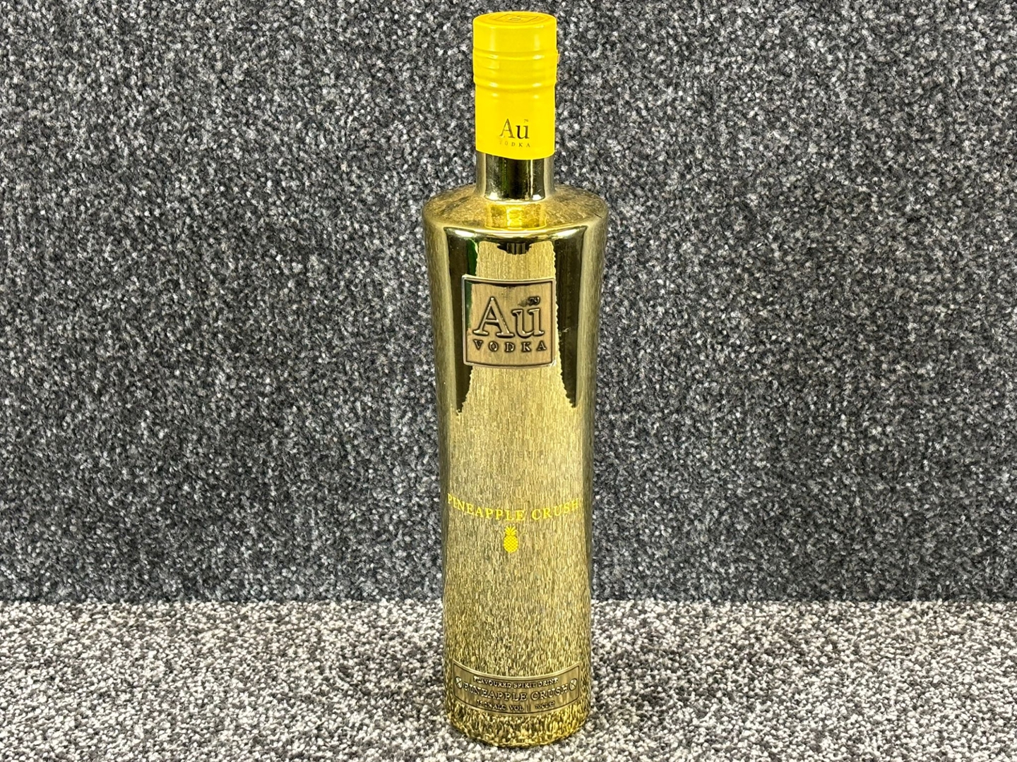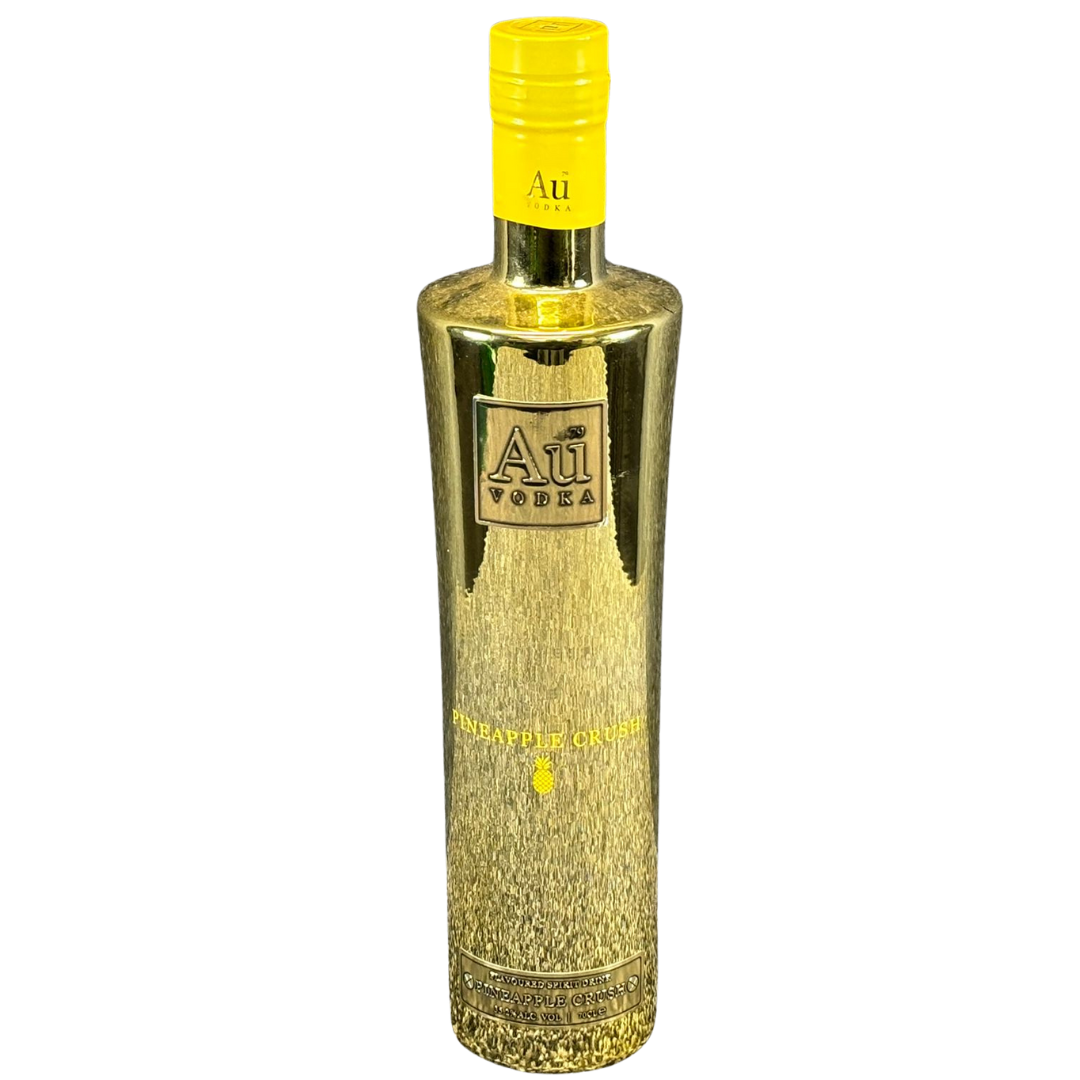 A 70cl bottle of AU Vodka Pineapple Crush delivers immediate shelf appeal with its unmistakable gold chrome finish and bright yellow accents. Bold, modern and luxurious in style, it reflects AU Vodka’s signature look while hinting at the vibrant tropical flavour within. The metallic shine and clean embossed branding make it a standout piece in any collection or party setup.