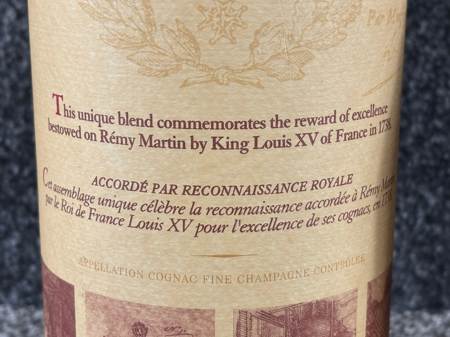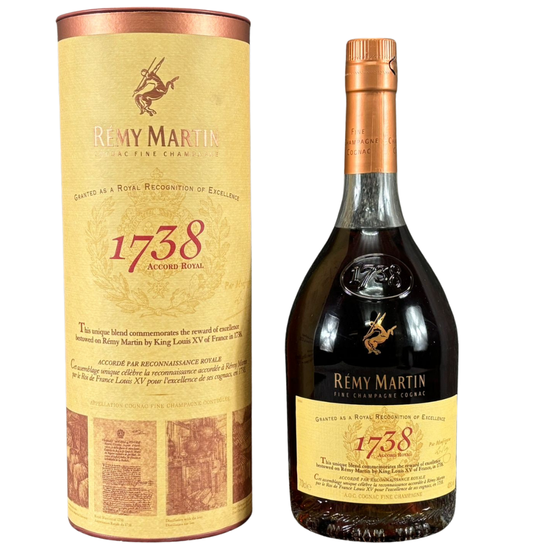 A bottle of Rémy Martin 1738 Accord Royal Cognac Fine Champagne in the 70cl size, presented in its original display box. This highly regarded expression celebrates the historic royal warrant granted to Rémy Martin by King Louis XV in 1738 — a mark of exceptional quality that continues to define the house’s reputation today.