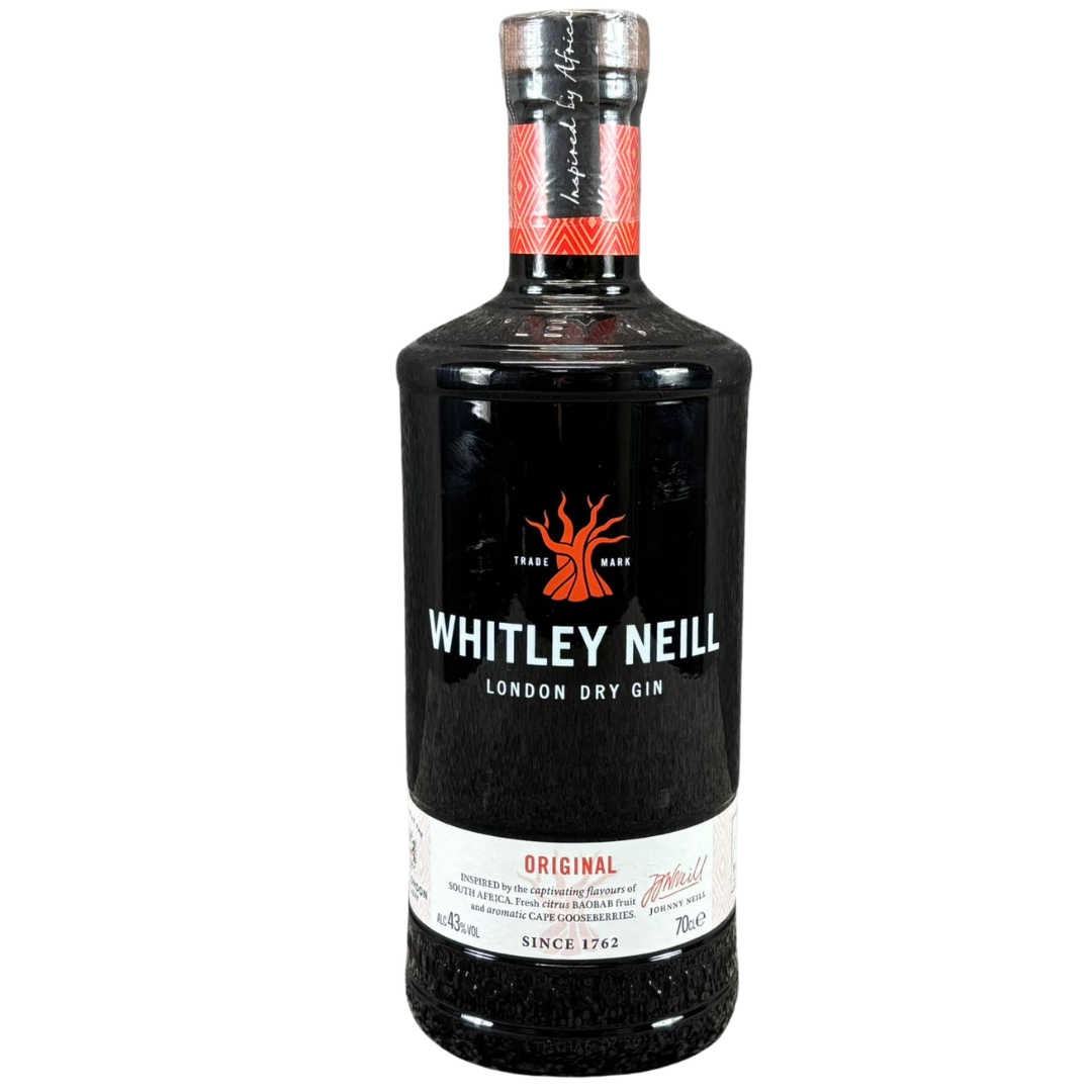 A bottle of Whitley Neill Original Gin in the 70cl size, presented in its sleek black bottle with the distinctive orange baobab tree emblem. The bold, modern design stands out instantly and reflects the gin’s inspiration from African botanicals, giving it a premium and adventurous aesthetic. It’s a stylish and eye-catching addition to any home bar or gin collection.