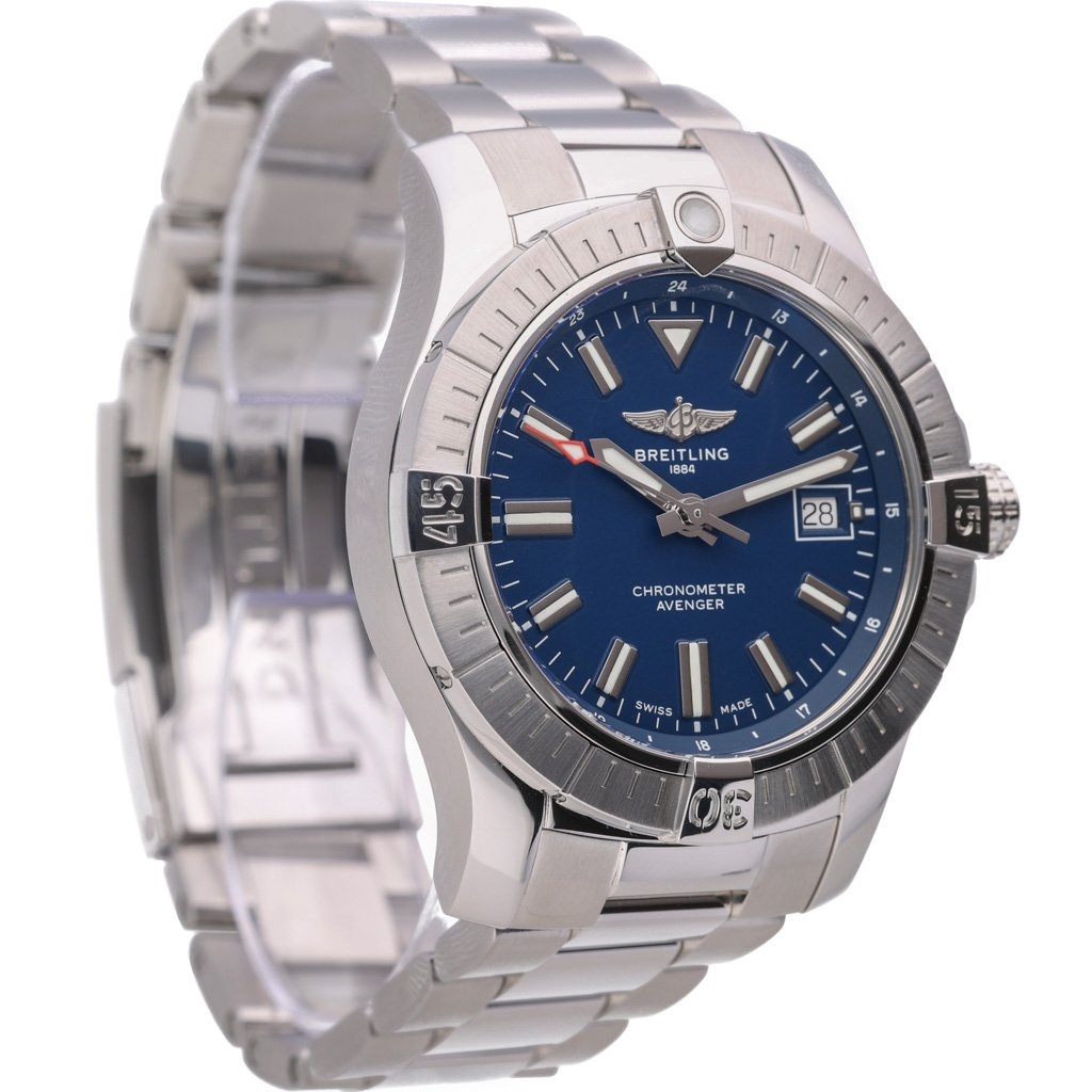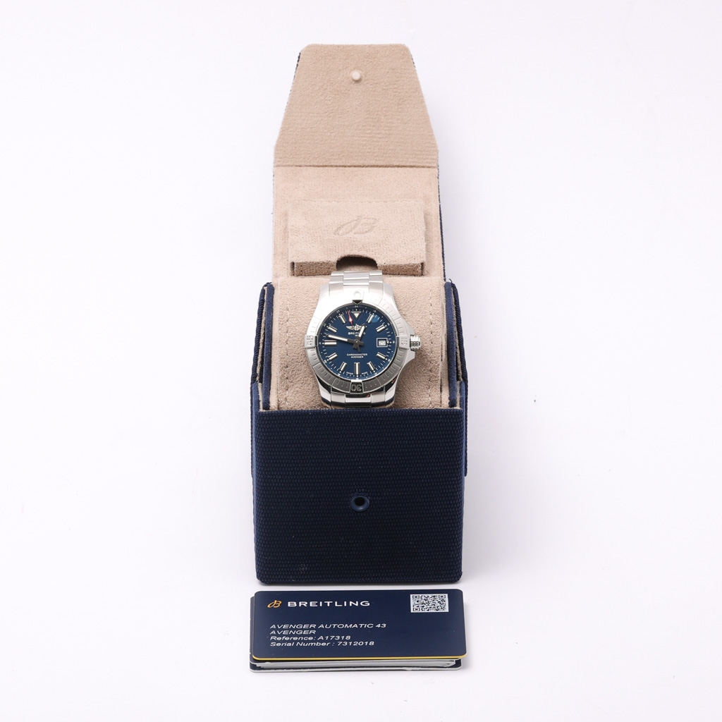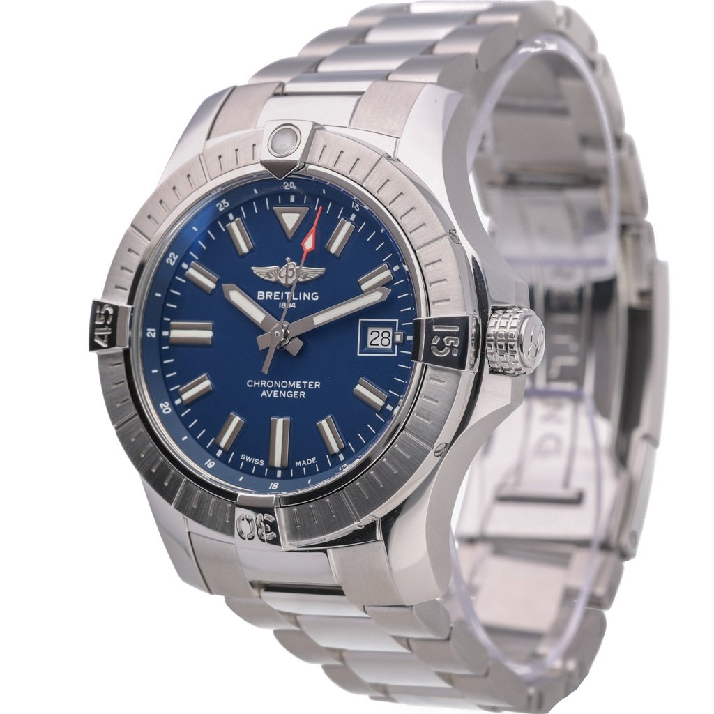 A Breitling Avenger Watch, model A17318, presented in immaculate condition. This striking 2022 model features a 43mm stainless steel case, matching strap and clasp, and a bold blue dial that captures the spirit of aviation and adventure. Powered by a precise automatic movement and backed by its original Breitling paperwork, it also includes a 12-month WLC warranty and is fully boxed and certified.