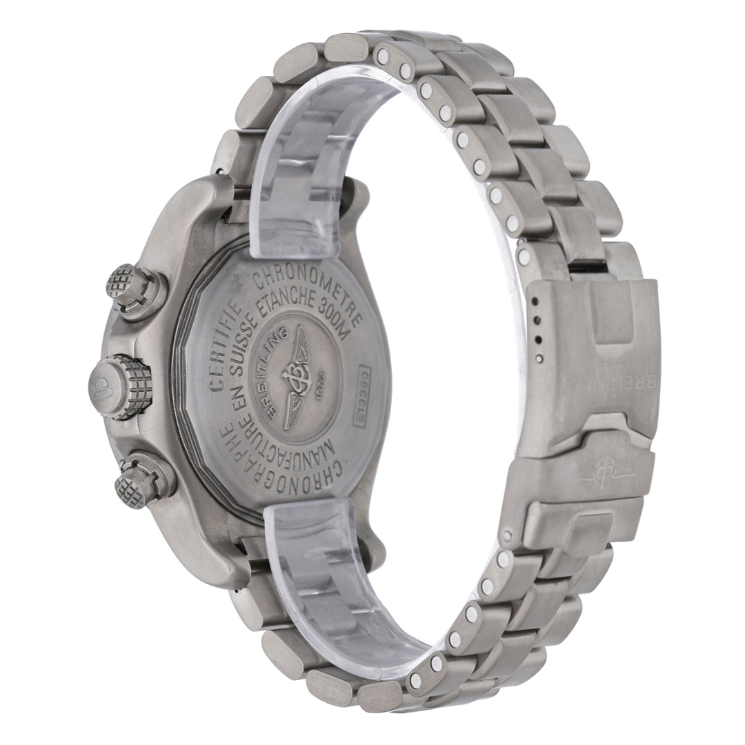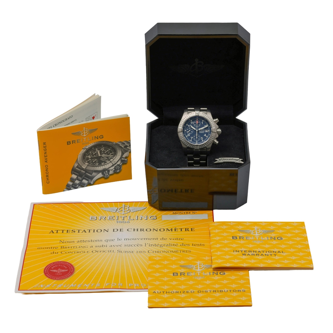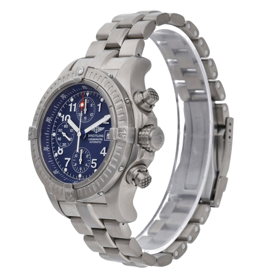 A Breitling Avenger Watch crafted in lightweight titanium, combining robust engineering with the bold, functional design that defines the Avenger collection. Built for extreme durability and professional performance, the Avenger line is designed to withstand demanding environments while maintaining the precision and reliability expected from Breitling’s aviation-inspired timepieces.