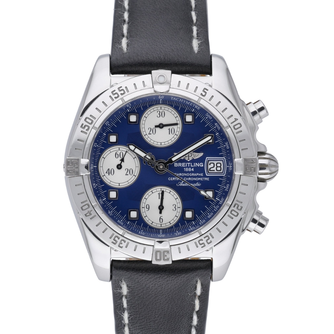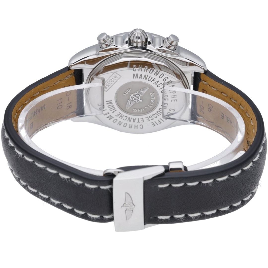 At its core lies the renowned Breitling Calibre 13 automatic movement — a COSC-certified chronometer known for its accuracy, robustness, and an approximately 42-hour power reserve. The chronograph function delivers precise time measurement, supported by smooth pushers and a screw-down crown ensuring water resistance. The black leather strap, accented with white stitching and secured by a stainless steel clasp, completes the look with sporty sophistication.