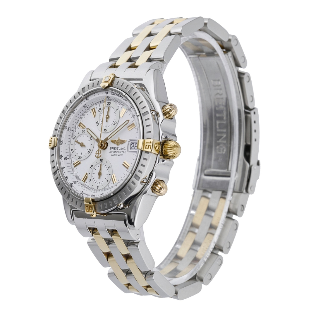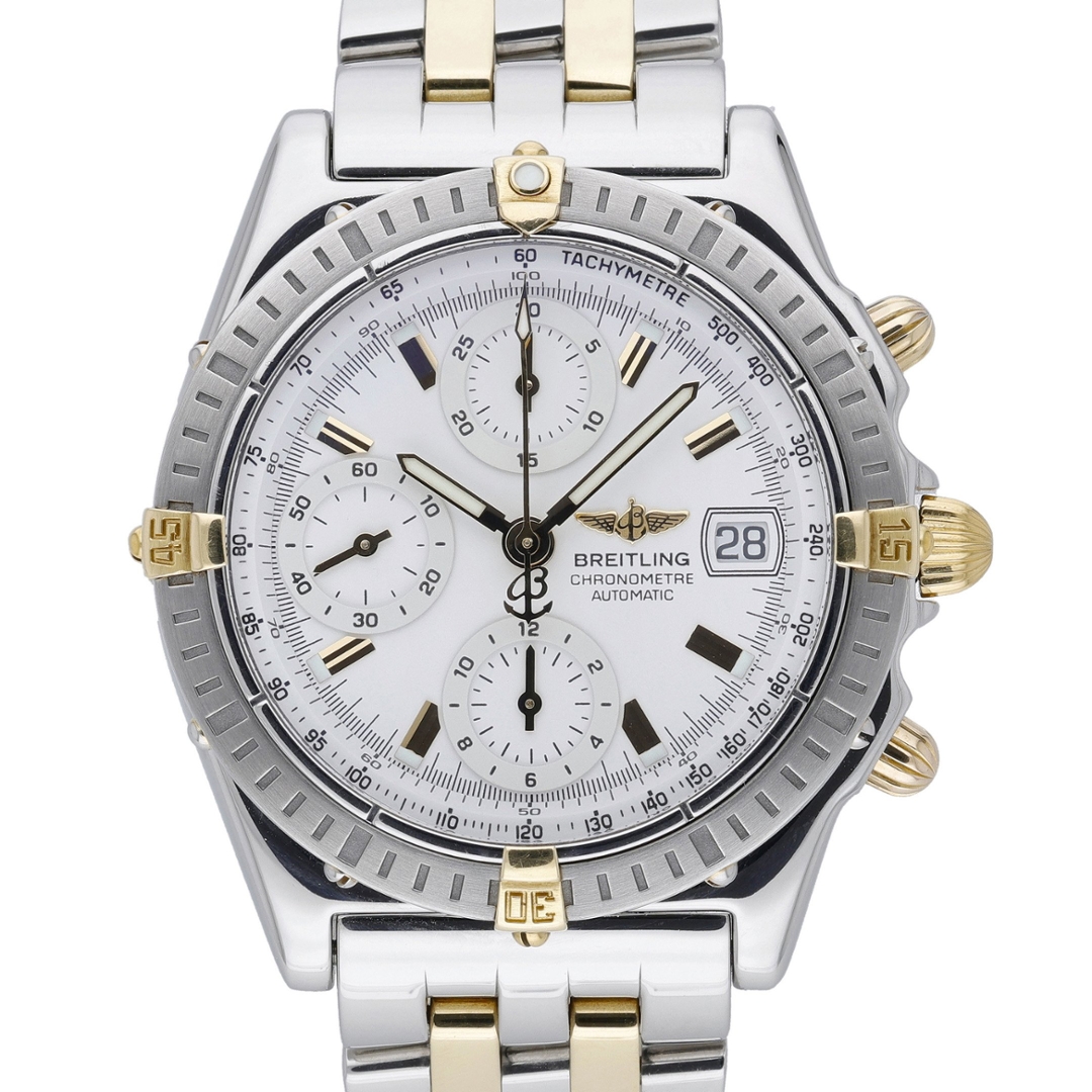 A Bi-Metal Breitling Chronomat, crafted in stainless steel and 18ct yellow gold and presented on a crisp white dial. Model B13352, from 2003, this 39mm classic captures everything collectors love about early Chronomat design — bold rider tabs, unmistakable Breitling detailing, and a robust automatic chronograph movement built for precision.