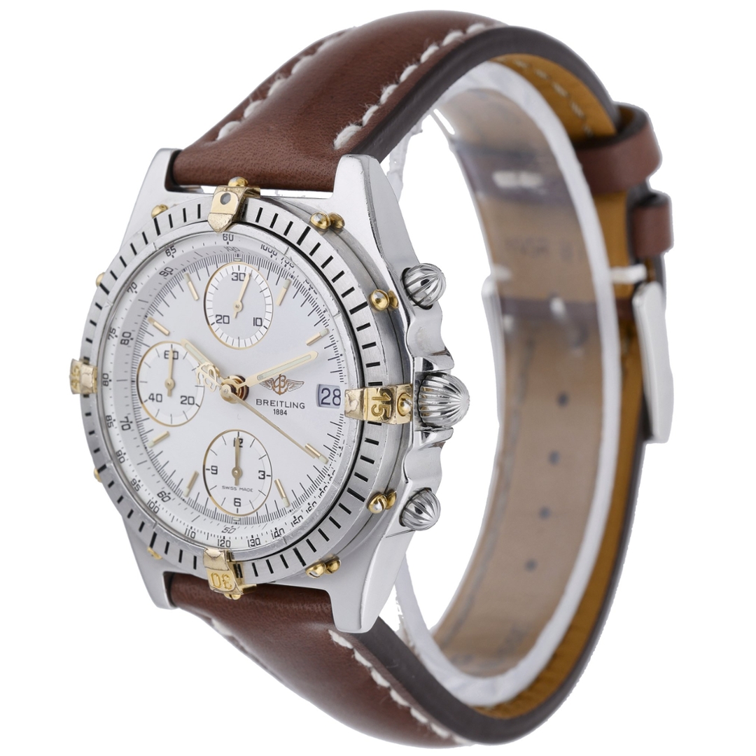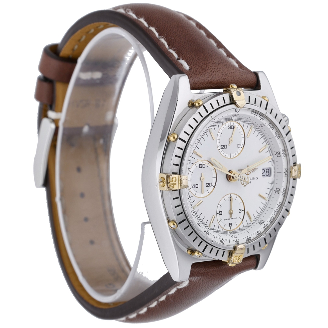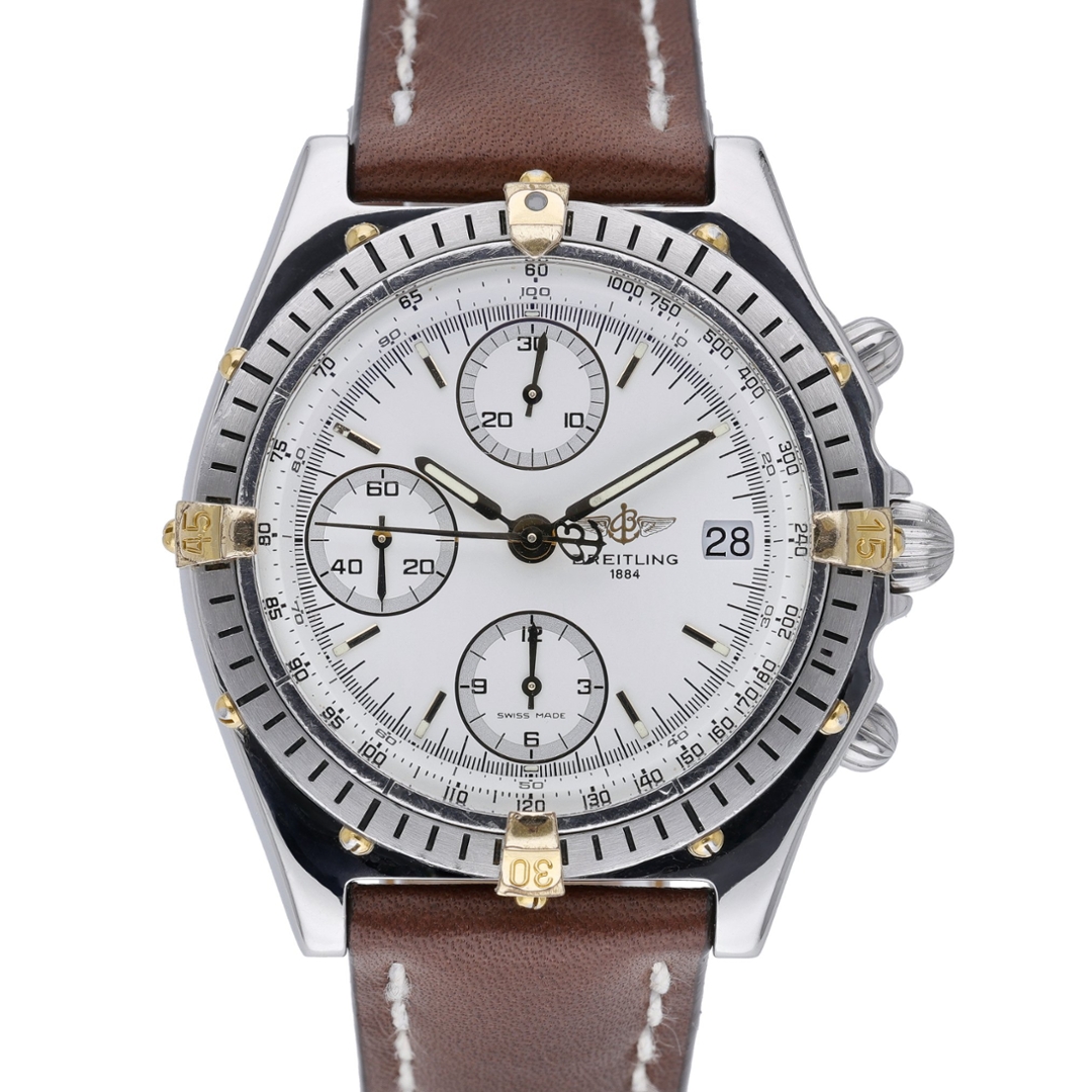 A bi-metal Breitling Chronomat watch crafted from stainless steel and 18ct yellow gold, presented on a crisp white dial that accentuates its distinctive aviation-inspired design. Model number D13047, this 1994 example is powered by the reliable Breitling Calibre 13 automatic movement, offering chronograph precision and dependable performance. The 39mm case embodies the classic proportions of early Chronomat models, combining sporty presence with refined detailing that has become synonymous with the Breitling name.