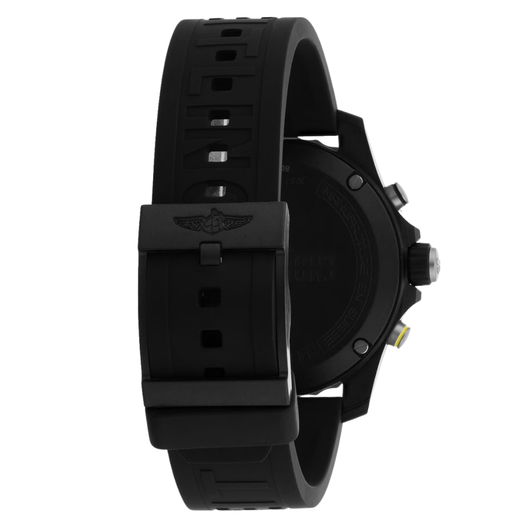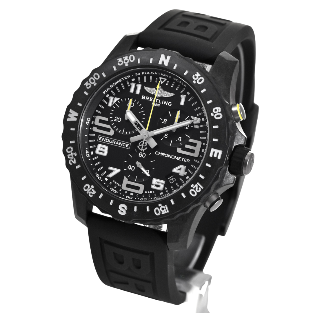 A Breitling Endurance Pro reference X82310, presented with a black rubber strap and lightweight Breitlight® case, is designed for high-performance wear with a bold, utilitarian aesthetic. The black dial is accented by clear Arabic numerals, contrasting sub-dials, and yellow highlights, delivering excellent legibility and a distinctly modern sports profile.