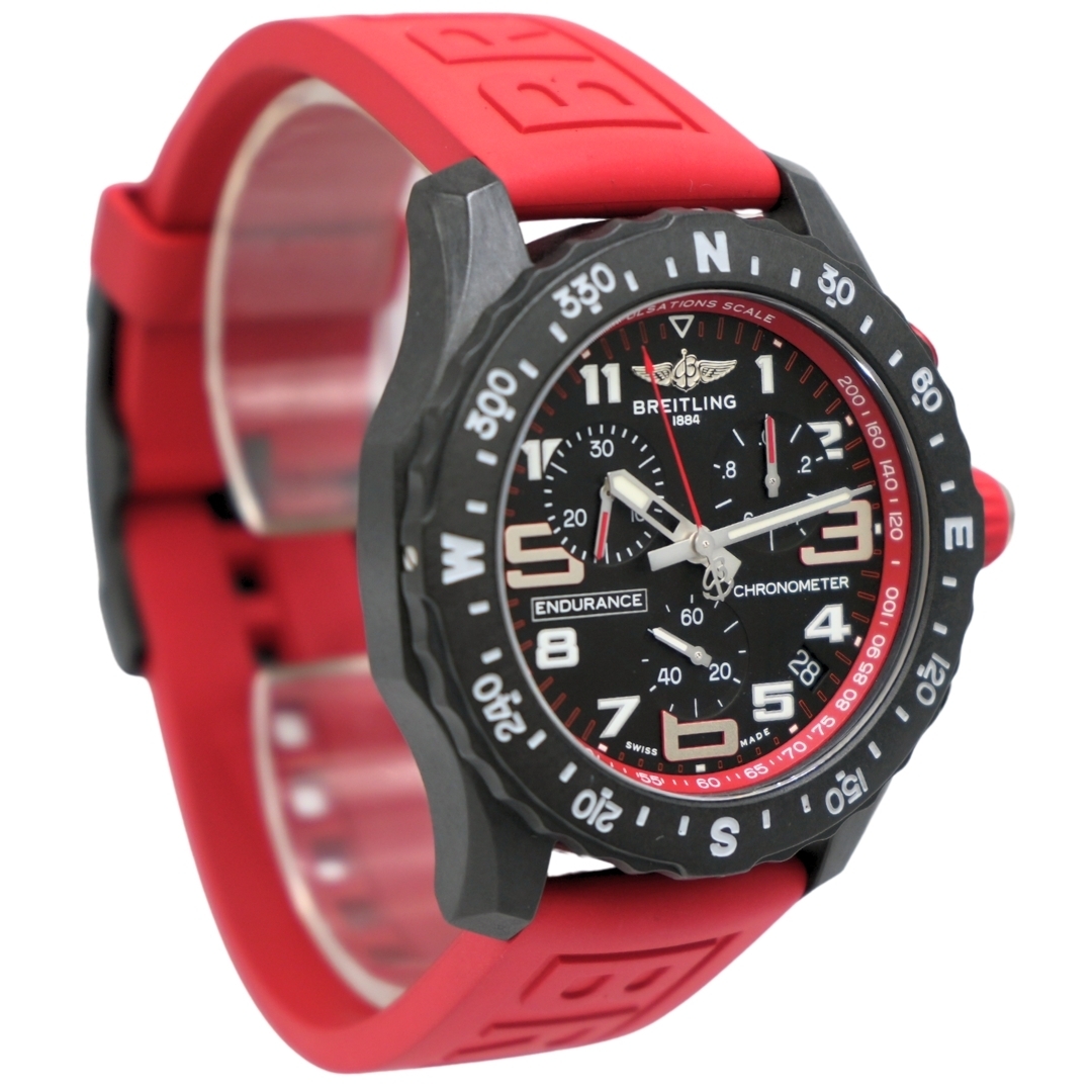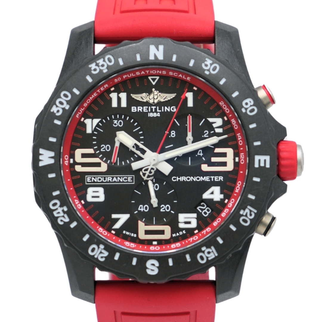 A Breitling Endurance Pro, reference X82310, is a modern, performance-led sports watch designed with durability and legibility at its core. Produced in 2023, the 44mm Breitlight carbon case is exceptionally lightweight and highly scratch-, corrosion-, and wear-resistant. Paired with a black dial, a matching bezel, and a vibrant red rubber strap.