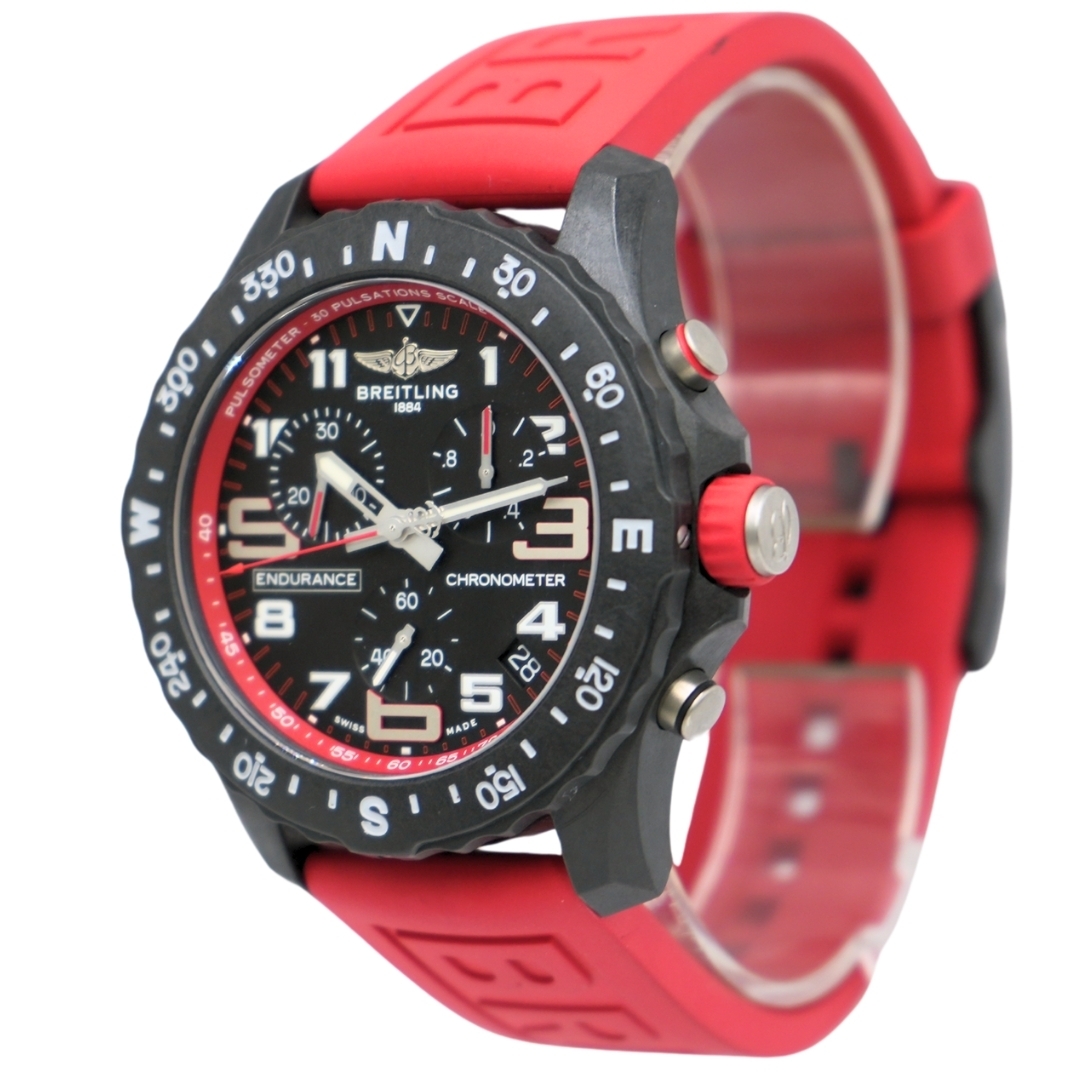 A Breitling Endurance Pro Watch, Red Rubber Strap with a Carbon Case and Clasp with a Black Bezel and Dial.