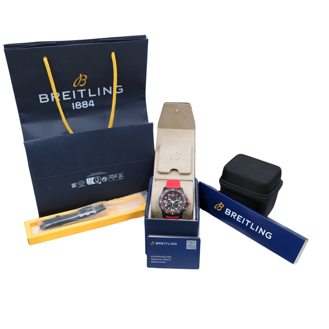 A Breitling Endurance Pro X82310 is a dynamic, high-performance sports watch that combines precision with striking design. This watch is lightweight and durable, featuring a 44mm carbon case that offers exceptional impact and wear resistance. The sleek black bezel and dial provide a bold, tactical look, while the red rubber strap adds a vibrant touch, ensuring comfort and flexibility for all-day wear.