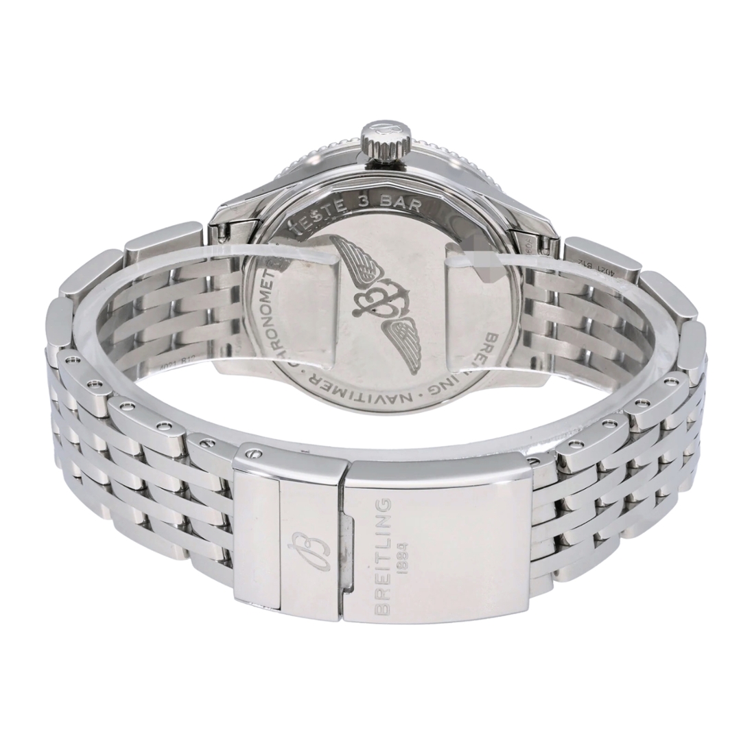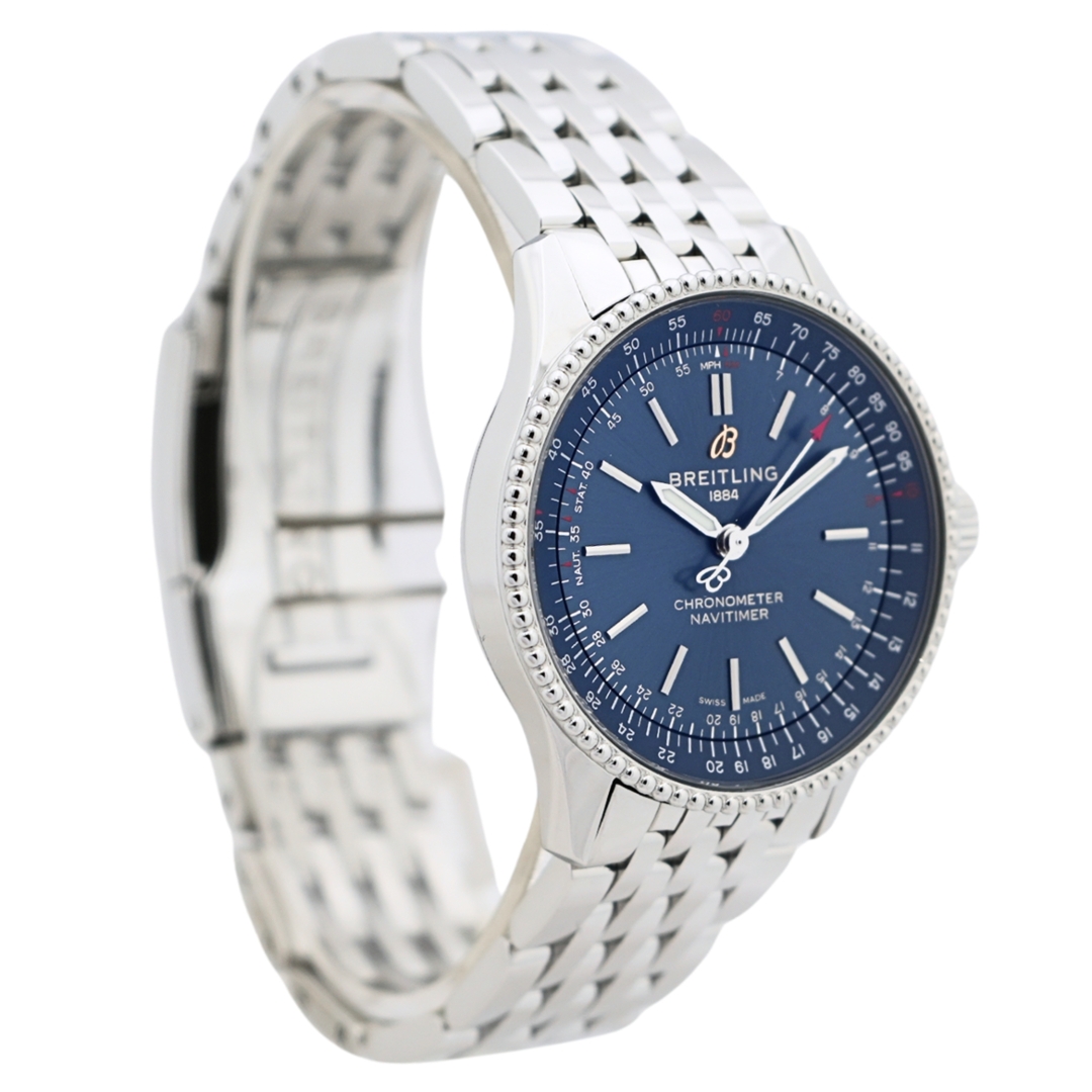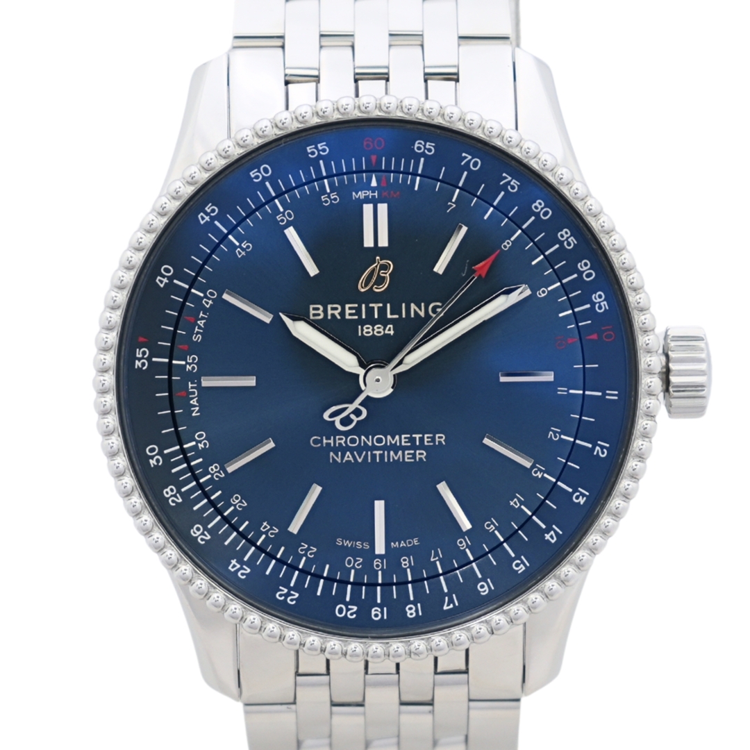 The striking blue dial is sunray finished, shifting beautifully under the light, and paired with applied indexes and a red-tipped hand that enhances legibility. Housed in a stainless steel case and fitted to a matching bracelet, this model exudes timeless sophistication. Beneath the surface, it is powered by the Breitling Calibre 17 automatic movement, a COSC-certified chronometer known for its reliability and precision, offering a power reserve of approximately 38 hours. Water-resistant to 30 metres, it remains practical while keeping its slim, classic proportions.