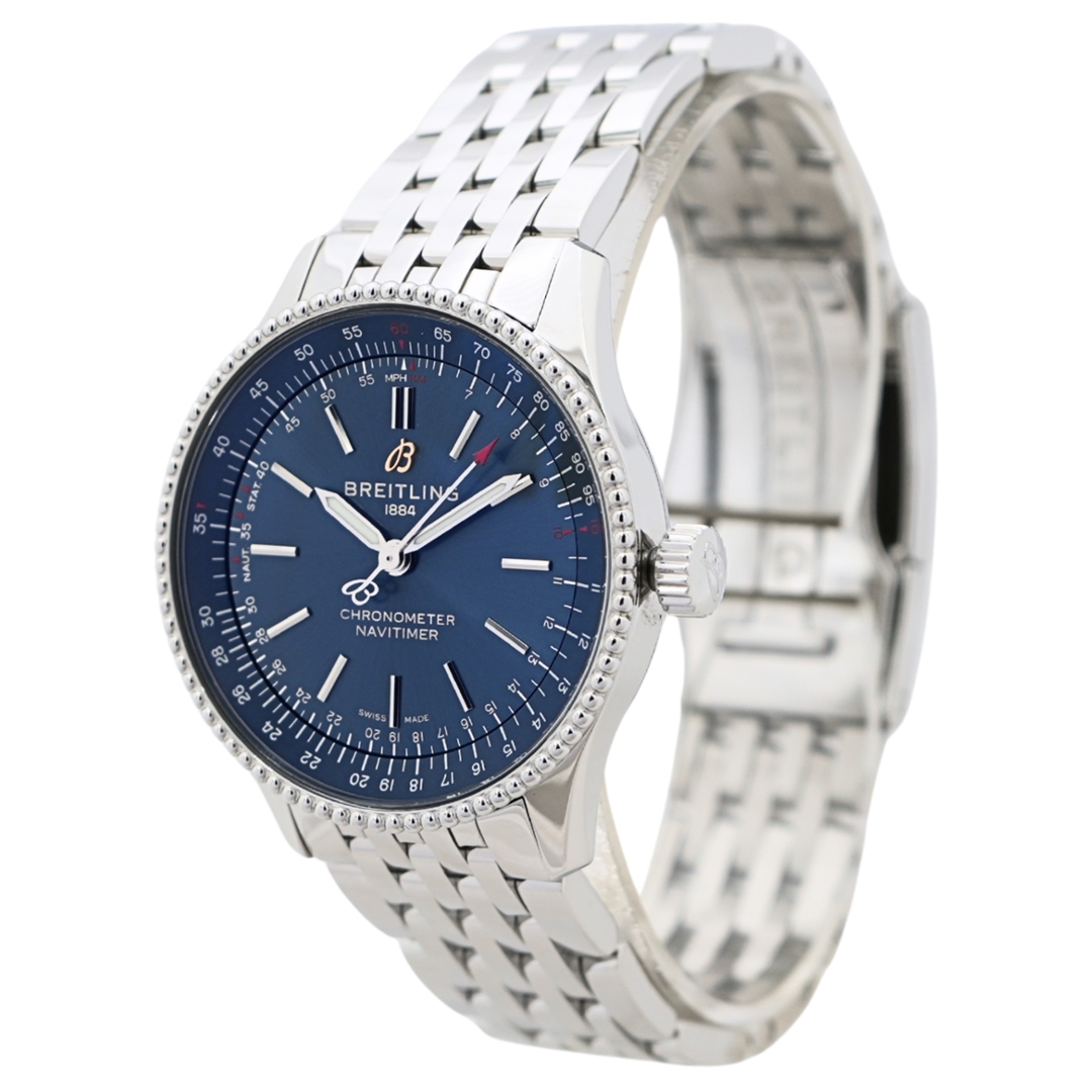 This example is offered in good condition, complete with its original Breitling paperwork, presentation box, and a 12-month WLC warranty. A perfect introduction to one of Breitling’s most important collections, the Navitimer 35 blends heritage design, mechanical excellence, and everyday wearability – making it an excellent choice for collectors and enthusiasts alike.