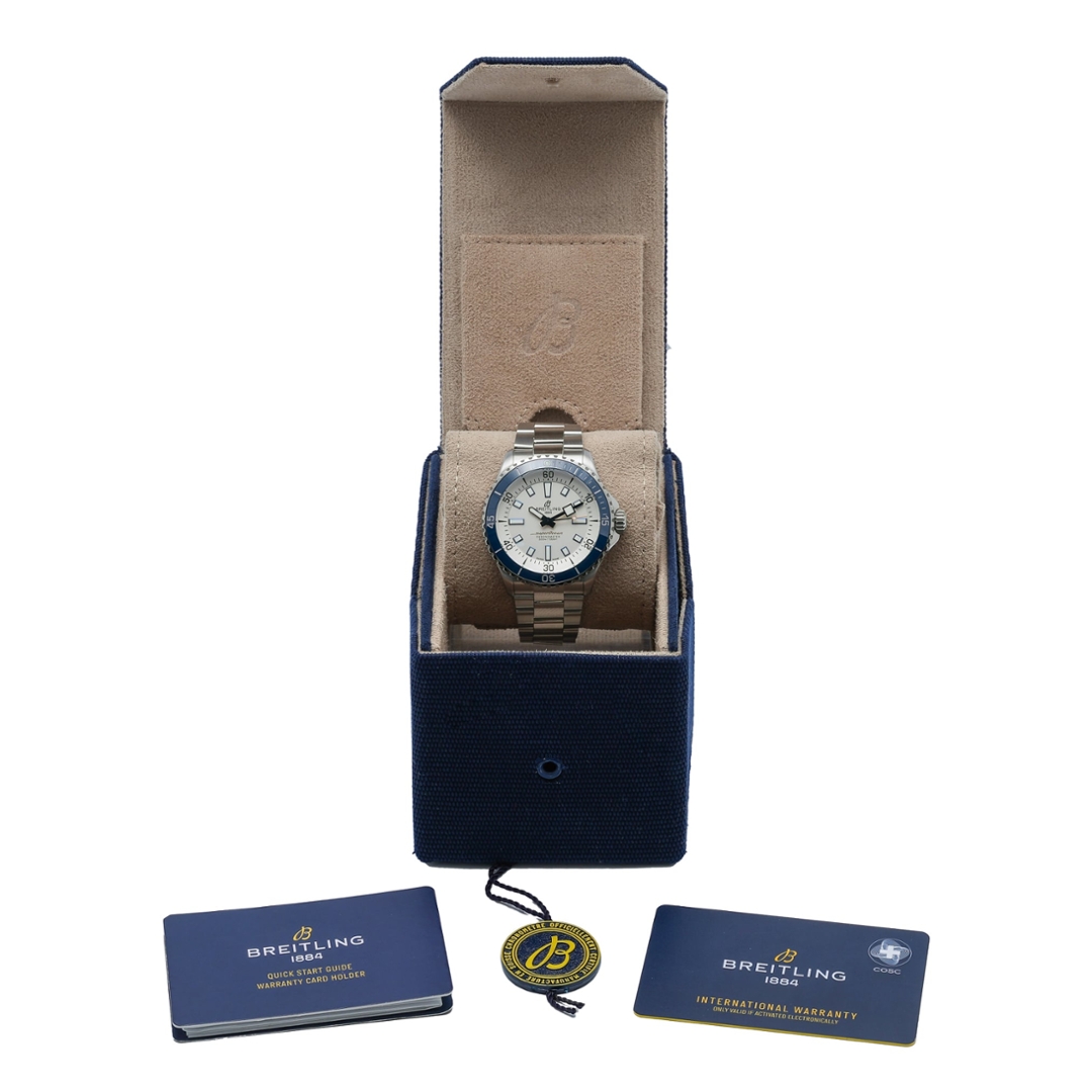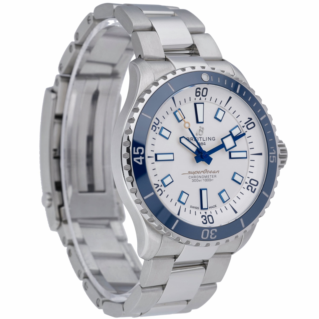 A Breitling Superocean 42 is a clean, highly versatile modern dive watch that combines professional capability with a fresh, contemporary aesthetic. The 42mm stainless steel case is paired with a crisp white dial and a contrasting blue unidirectional bezel, creating excellent legibility and strong visual balance. Applied hour markers, broad luminous hands, and a clearly defined minute track ensure clarity in all conditions, while the date display at six o’clock adds practical everyday functionality.