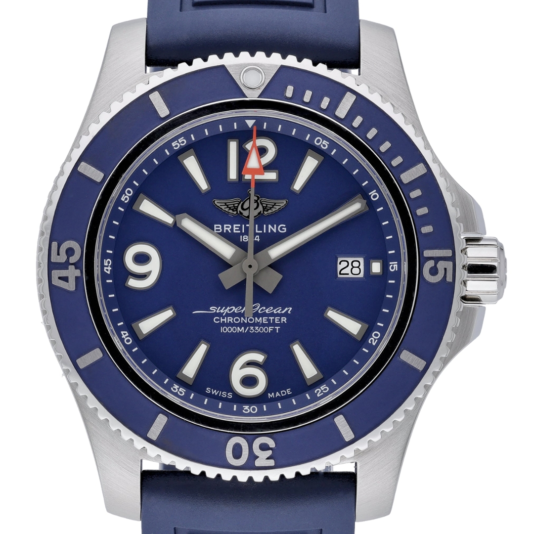 A Breitling Superocean 44 is a bold, competent professional dive watch designed for serious performance both in and out of the water. The substantial 44mm stainless steel case is paired with a striking blue unidirectional bezel and matching blue dial, delivering excellent legibility through oversized Arabic numerals, broad luminous hands, and a clearly defined minute scale. A discreet date window at three o’clock adds everyday practicality.