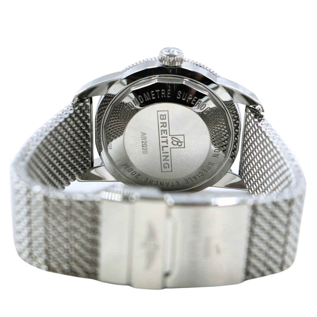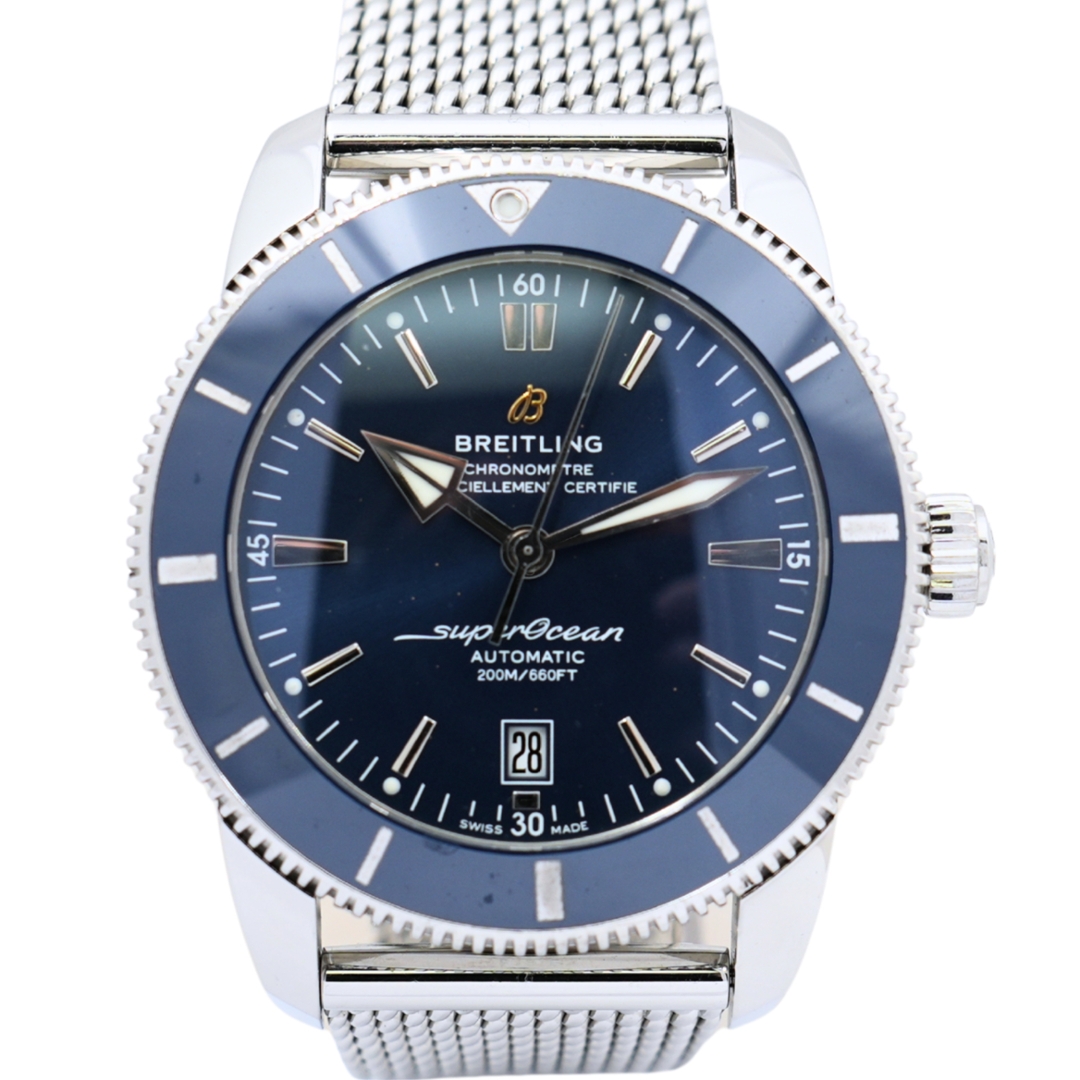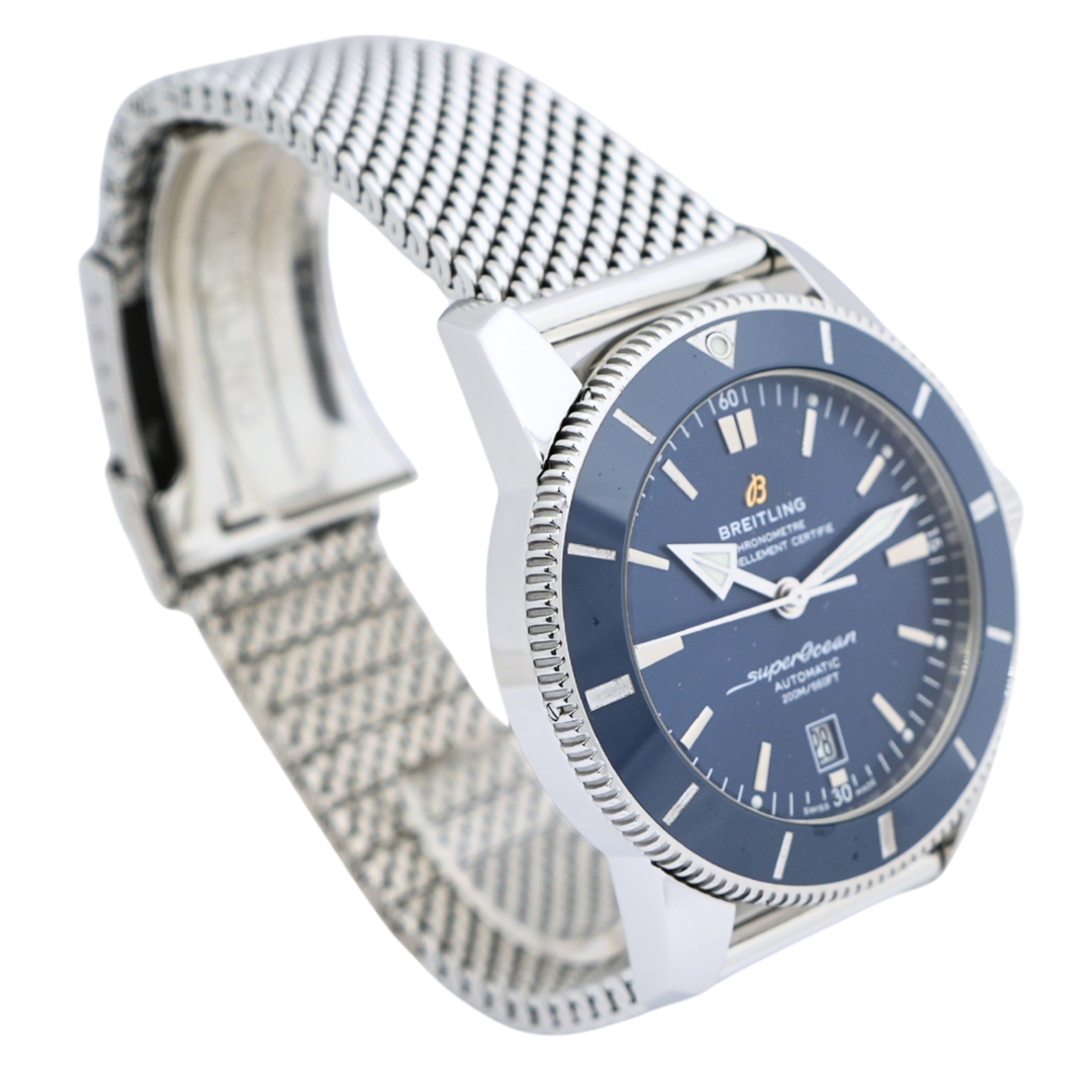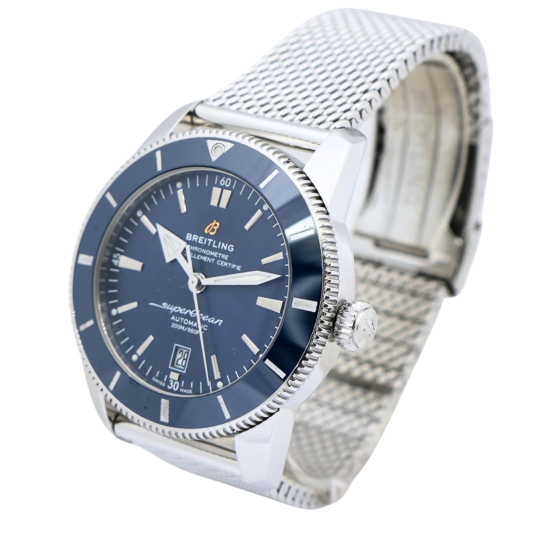 This stainless-steel Breitling Superocean Heritage II B20 46 showcases the bold, ocean-inspired design that has defined the Heritage collection for decades. The deep blue bezel and matching blue dial provide a clean, modern aesthetic while retaining the vintage cues of the original 1950s Superocean. Its 46mm case delivers strong wrist presence, while the mesh bracelet completes the classic dive-watch look that continues to attract collectors and enthusiasts.