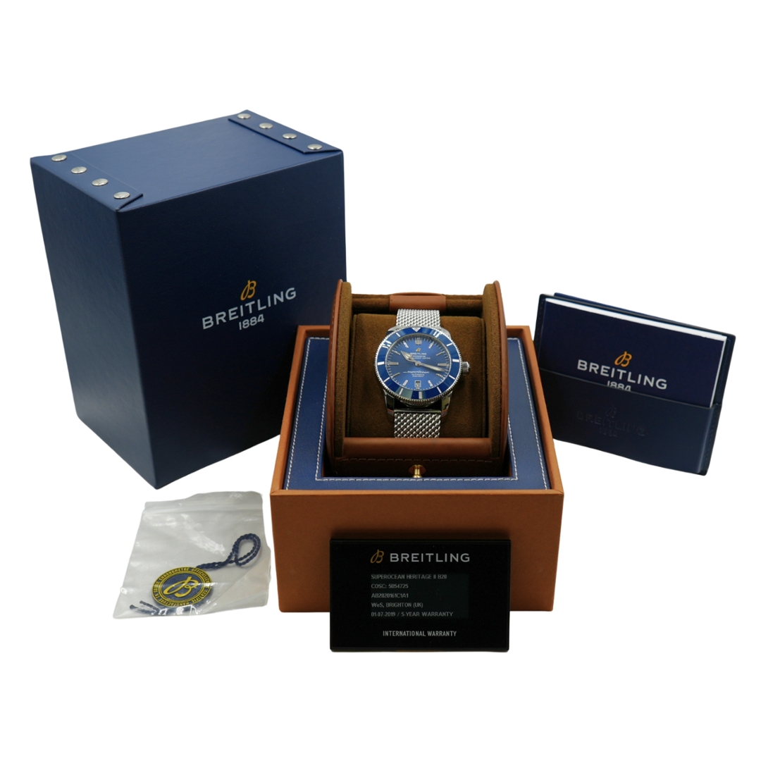 A compelling option for those seeking a robust, investment-minded dive watch, the Superocean Heritage II combines modern performance with timeless design. Its striking blue configuration and complete set make it a standout piece within the Breitling range.